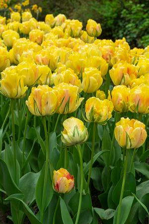 Tulipa 'Akebono' is a breathtaking Double Late Tulip that transforms gardens with its peony-like blooms. These magnificent flowers showcase primrose-yellow petals often adorned with delicate red edges and pale raspberry striations, creating a captivating visual display. Standing 14-22 inches tall, 'Akebono' brings elegance and charm to any landscape during late spring.
