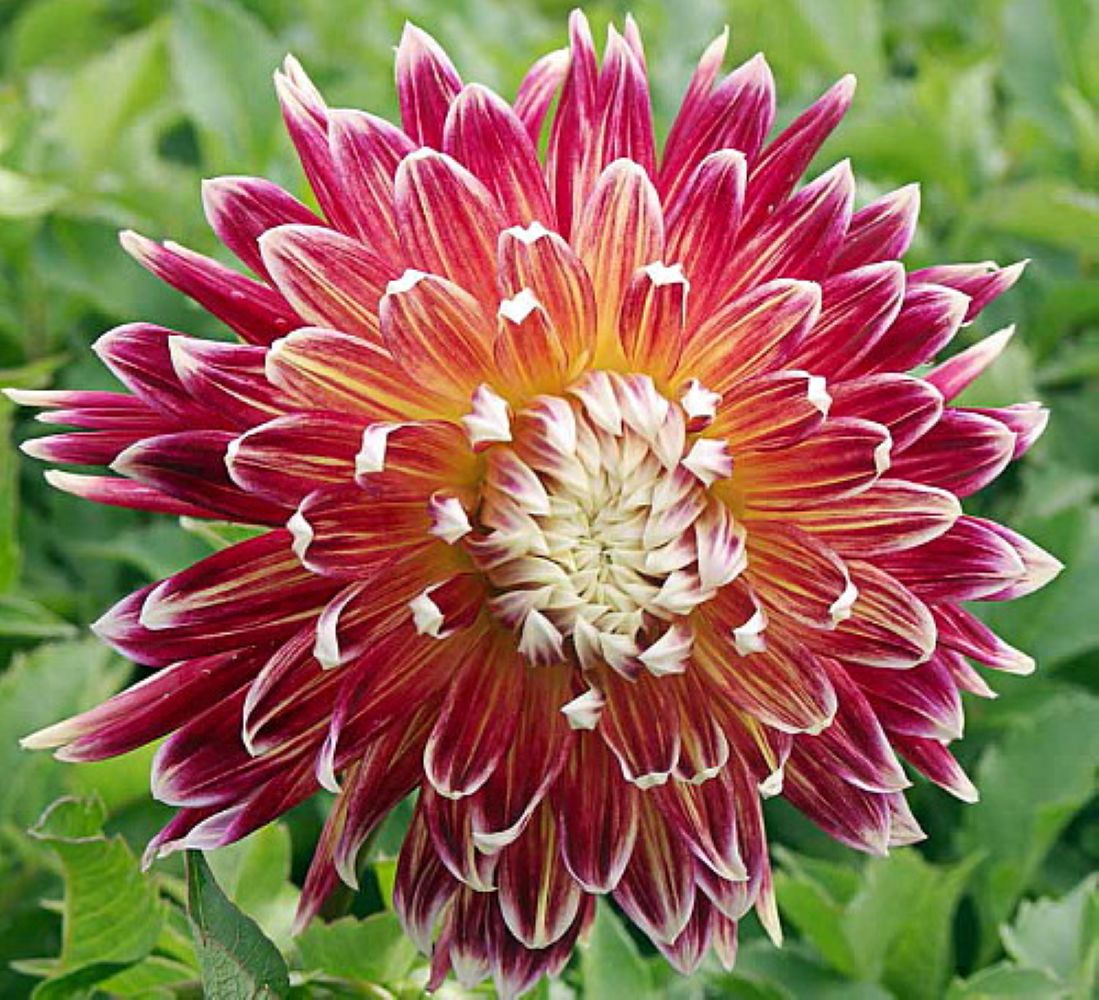 Burnt red with white tips. This new strain of Dahlias was first introduced in Holland during the 1992 Floriade World Flower Exhibition, where they won several medals of honor. They originated in Japan and the key characteristics is the unusual clear marking of colors in their flower petals. The blooms are 4" across and they make excellent cut flowers.