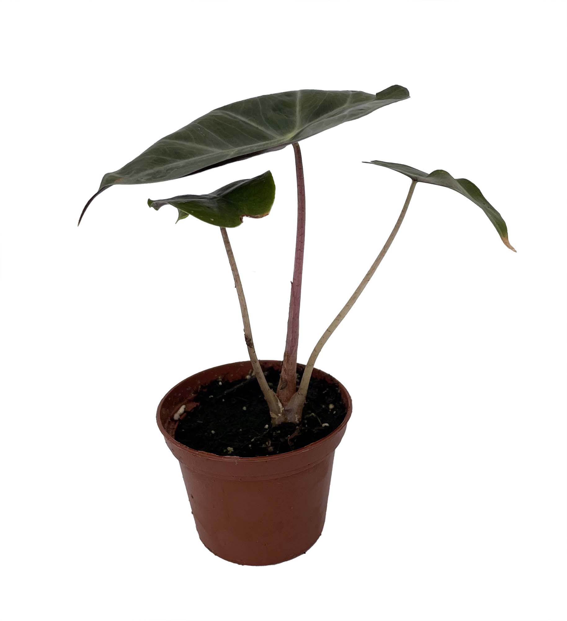 A beautiful tall and regal alocasia with bright pink stems fitting the name 'Pink Princess'. This alocasia is a striking stand-alone feature, requiring watering once a week. It will do well in smaller pots while still growing to a tall size.