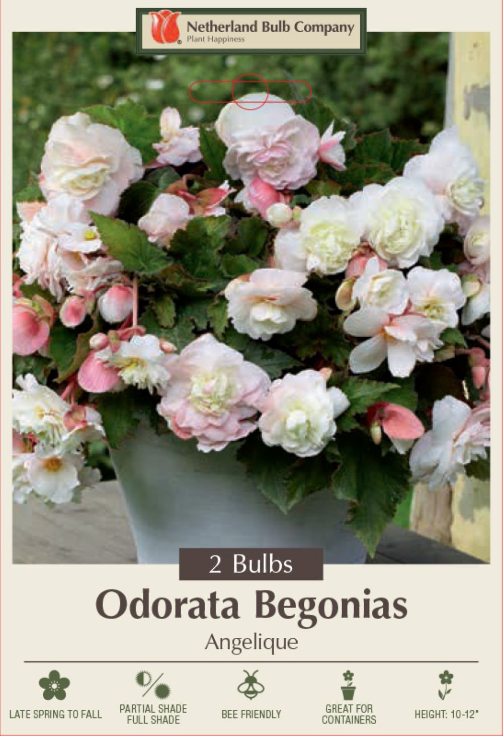 This wonderful fragrant Begonia has pastel pink flowers. The green foliage is distinctively marked with bronze. This Begonia will brighten any container or shade garden. World-famous Belgium bulbs, the finest imported strain of Begonias now available to the American market. Fully double in bright, non-fading colors. They provide long-lasting vibrant color and beauty. Plant in partial shade. They are easy to grow if they get plenty of water and protection from wind and direct sunlight. Adds floral beauty to porch, patio or windows.