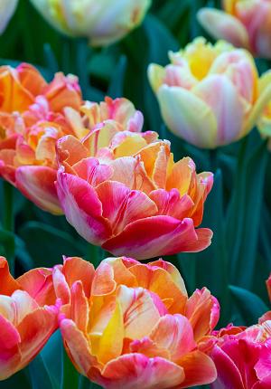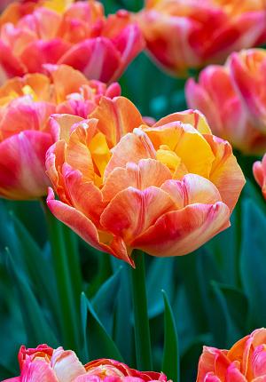 Tulipa 'Apricot Symbiose' is a captivating double early tulip that transforms gardens with its lush, peony-like blooms. These stunning flowers evolve from soft yellow to rich apricot and coral tones as they mature, creating a dynamic color display throughout their blooming period. Supported by sturdy stems that stand 14-18 inches tall, these resilient beauties make an unforgettable statement in spring landscapes and floral arrangements.