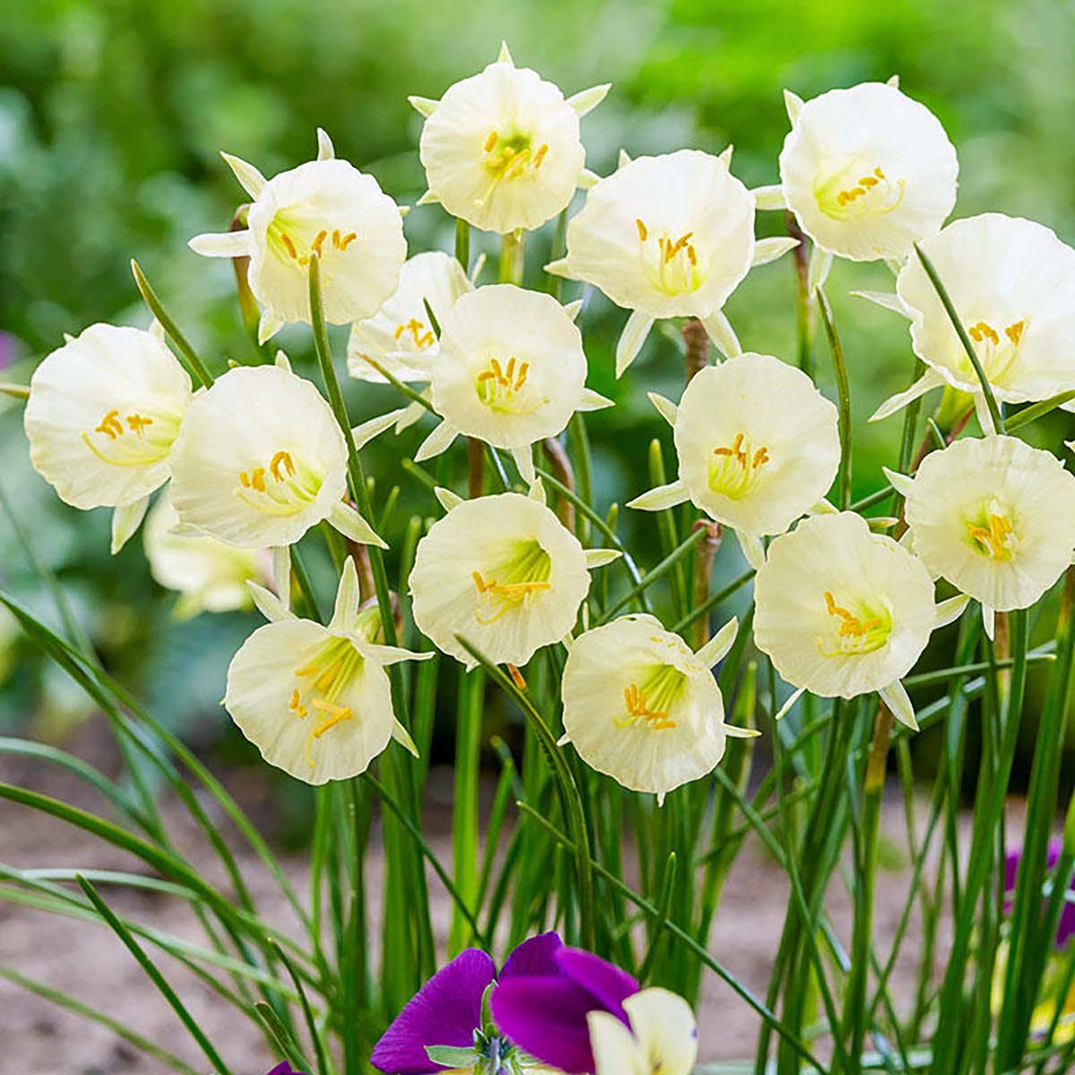 Exceptionally long bloomer. Also known as the hoop skirt daffodil, this fragrant award winner whirls and twirls through gardens and borders for weeks and weeks. Quite hardy and a prolific bloomer. Creamy blooms with creamy yellow at the center.