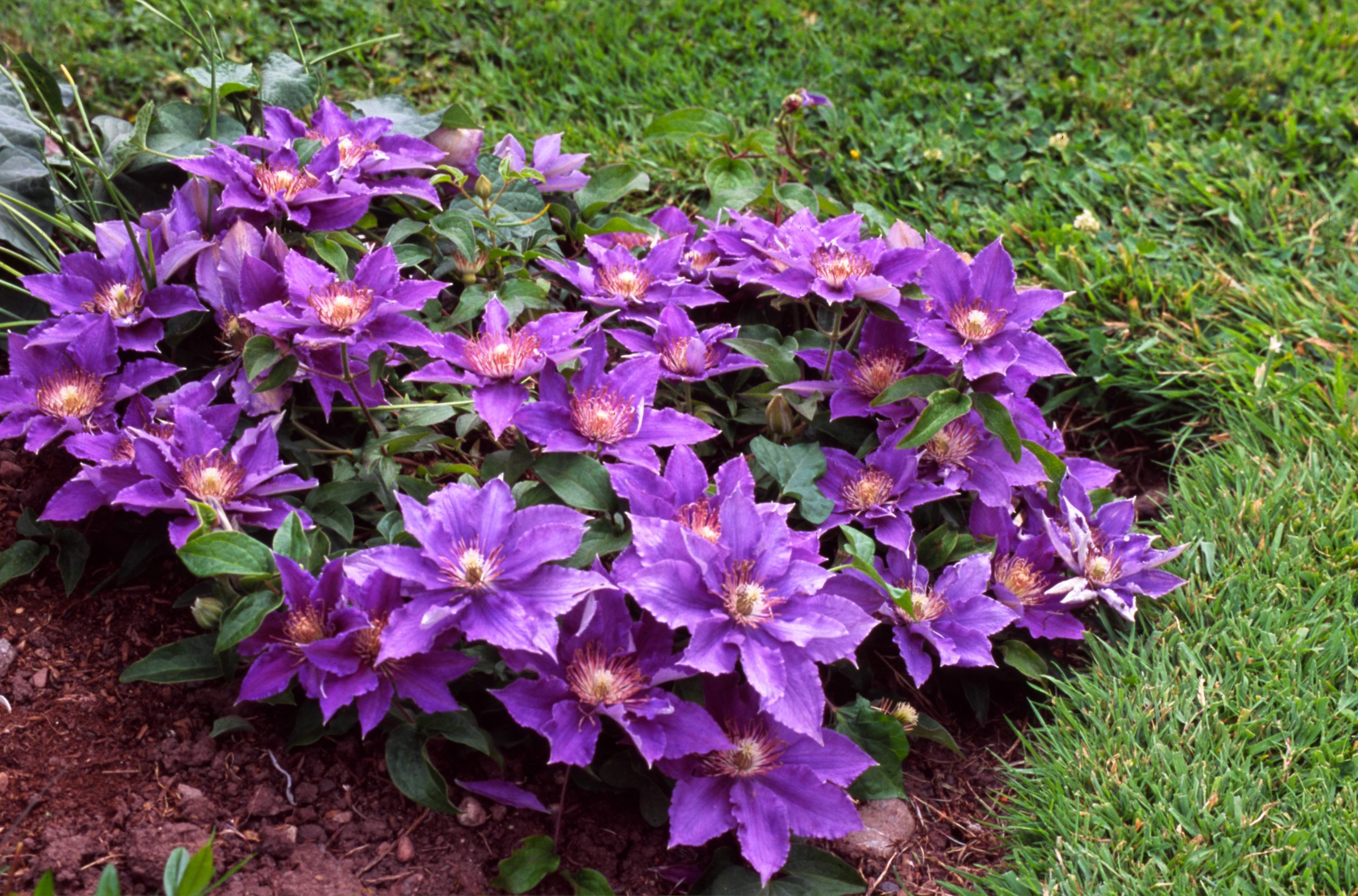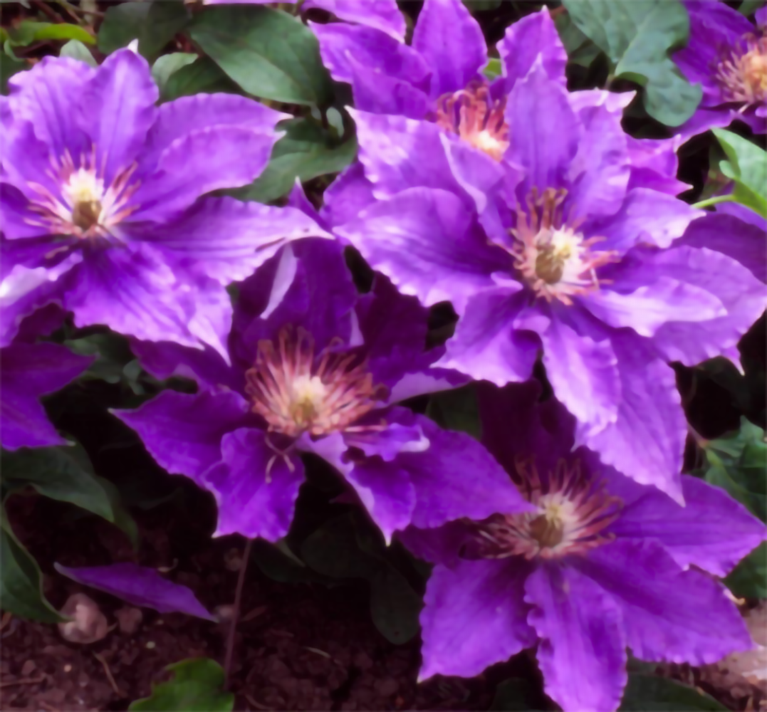 An Evison/Poulsen cultivar raised in Guernsey by Ramond Evison in 2005. Small pointed ruffled petals in pale violet/mauve with slight pinkish bar. Pink tipped anthers open to a lovely rosette shape. Very free flowering and flowers keep shape well. Blooms May-July. Nice low mounding clematis (1 foot). Pruning type 2.