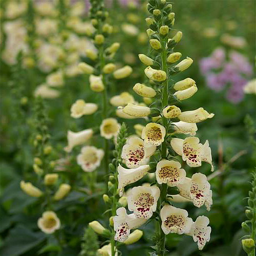 This is a unique selection of Foxglove, bearing tall spikes of soft creamy-white bells, each spotted inside with maroon purple. Unlike other types, ‘Camelot’ Foxgloves flower in both the first and second year before eventually setting seed and dying. Deadhead first-year blooms to encourage overwintering. These perform best in a rich, moist soil. Allow plants to form seed in the second year and they may self-sow to produce future generations. New seedlings that appear can be easily moved in their first season, while still small.