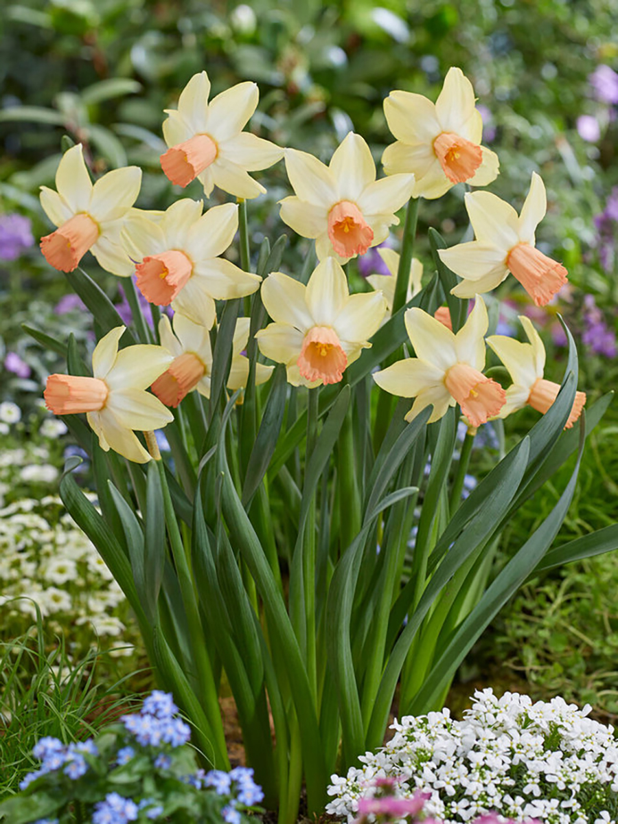 Creamy ivory white petals, like a skirt blowing in a gentle breeze, flow behind the elongated salmon-pink ruffled cups. Daffodil Carice is a Cyclamineus-type Daffodil. Cyclamineus Daffodils have a slender trumpet and reflexed petals. Most varieties are early spring bloomers. Consider planting them under deciduous trees that will not leaf out until after the Narcissus have bloomed. In fall, plant bulbs in deep, fertile, well-drained soil in full sun to light shade. Plant 6" apart and 6" deep in groups of 5,7,9 or more. Water during their growth period. After flowers bloom, let the foliage die back naturally. Once the foliage fades, cut it back.