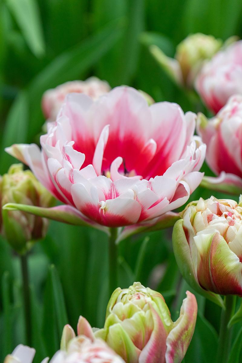 Tulipa 'Double Late Chandelier' is a breathtaking addition to any spring garden, offering the luxurious appearance of peonies in tulip form. These magnificent blooms feature fully double, deep rosy-red petals adorned with striking green flames and crisp white edges, creating a dramatic display that commands attention. Supported by strong, almost-garnet stems, these elegant flowers bring sophistication to landscapes and containers alike.