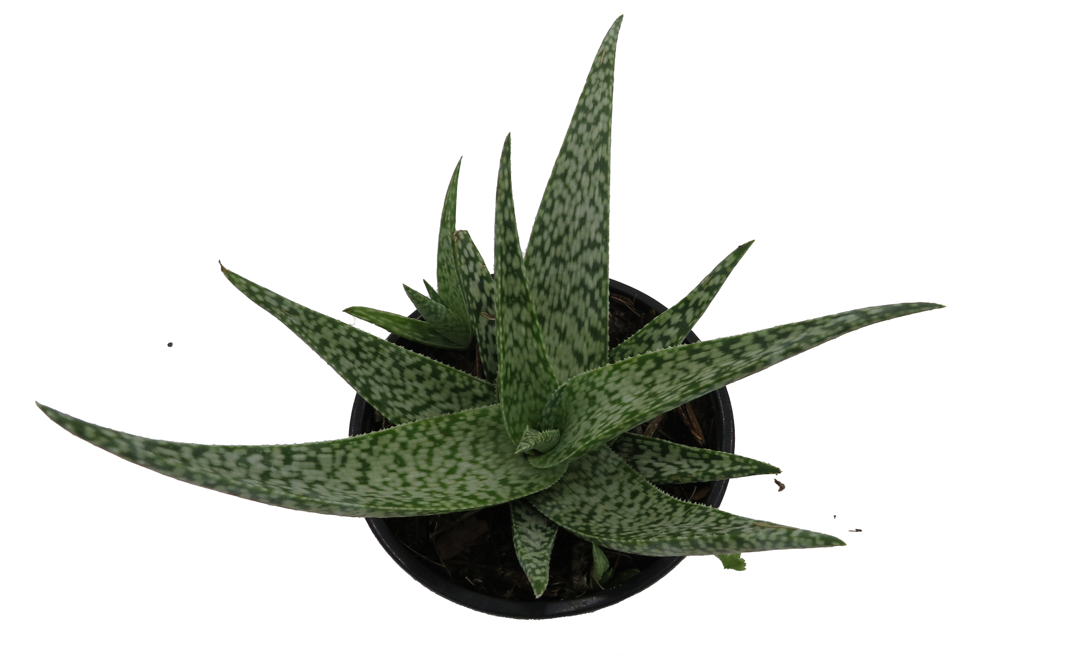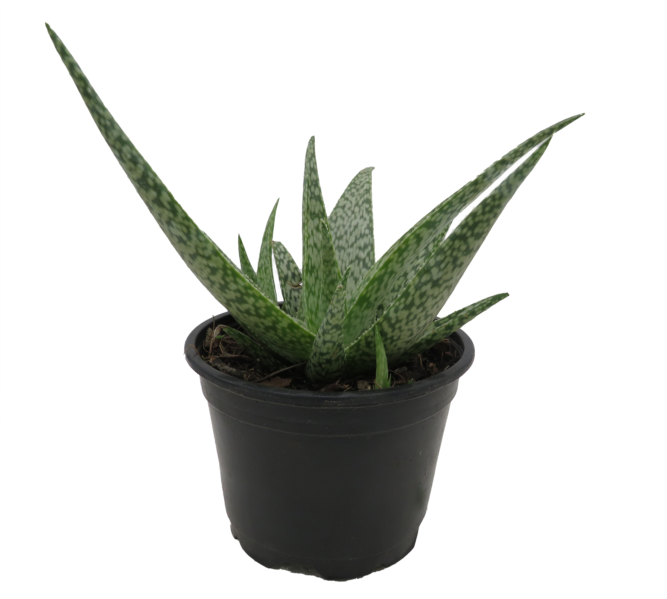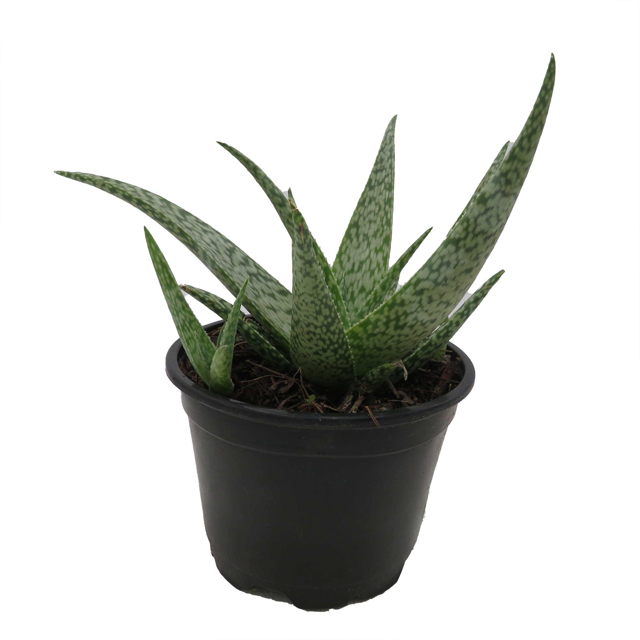Miniature aloe with thick green leaves. Grow in full sun. Sap is used on burns. Under high light conditions, the whiter it gets. Mature height is 4-6 inches. Perfect for sunny windows. Can tolerate some neglect. Measurements are approximate.
