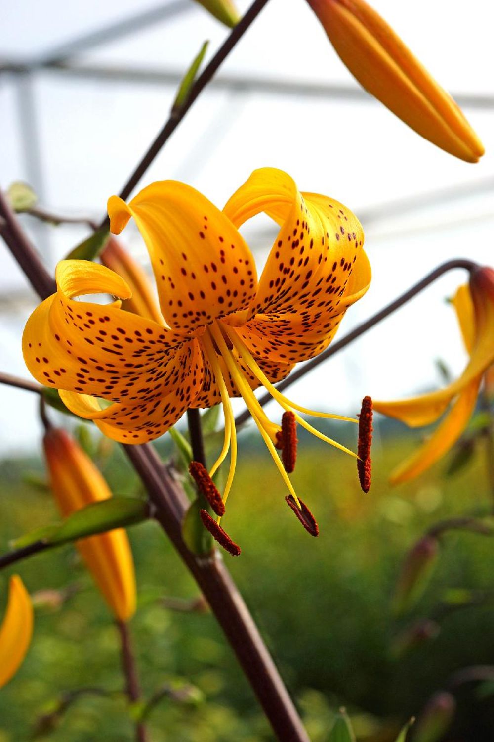 Around since the 1950's, this old strain was produced by the late Jan de Graaff of Oregon Bulb Farms. Over the years, the group has been narrowed down to only a few of the most vigorous clones. Neatly reflexed, golden yellow blooms are lightly spotted in brownish-black. 3 to 4 Feet. June.