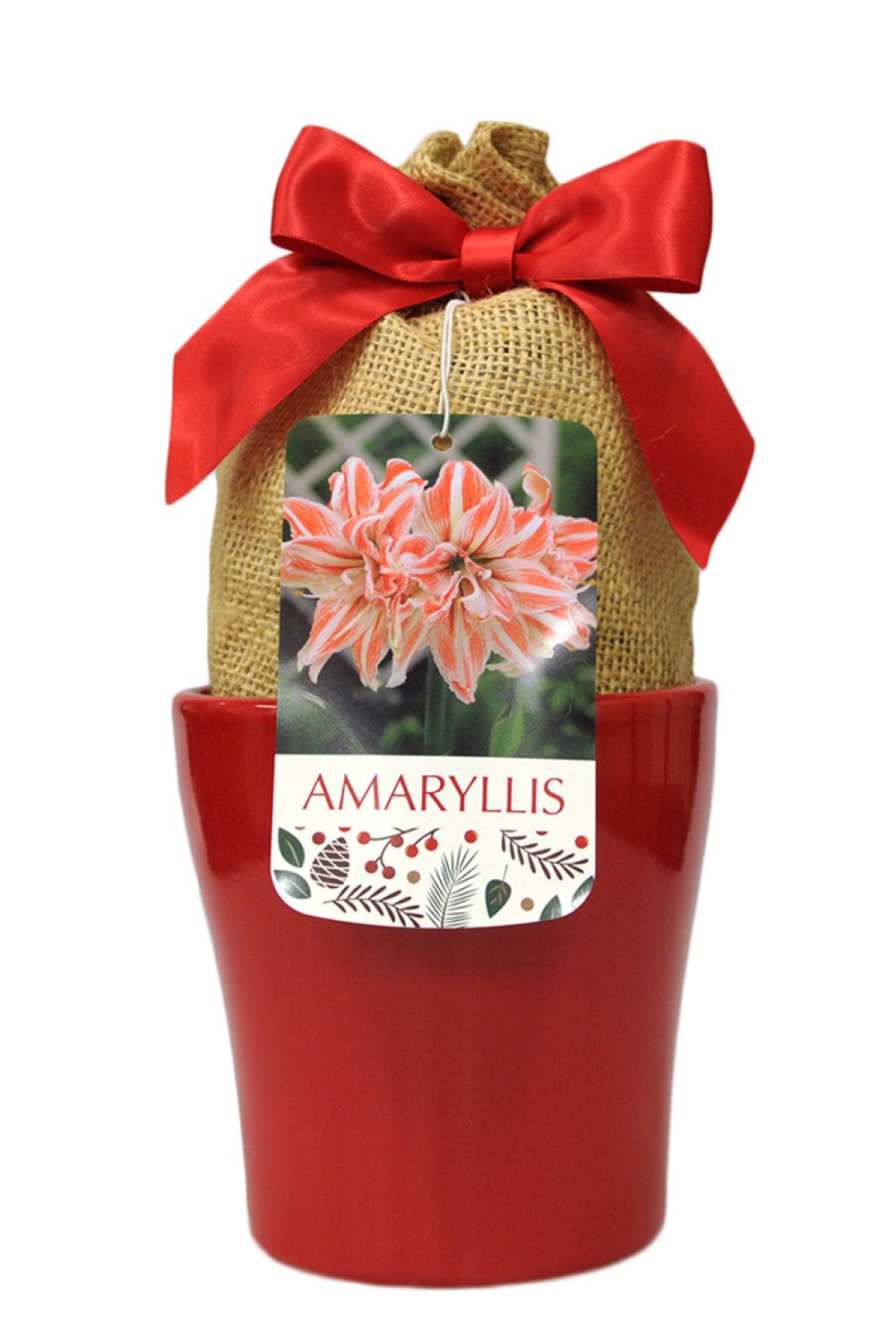 Giant 'DOUBLE' Amaryllis are easy and thrilling to grow indoors, and a great gift for a child or the home bound person. Unlike many other amaryllis bulbs on the market, our large hybrid bulbs will produce two 18-24" stems, each bearing 4 or 5 huge, long lasting flowers that are over 8 inches in diameter. Pot Size: 7.5" H x 6.5" W. Burlap Bag, Bow & Gift Tag, Growing Medium. Large premium amaryllis bulb (24/26 cm Bulb).