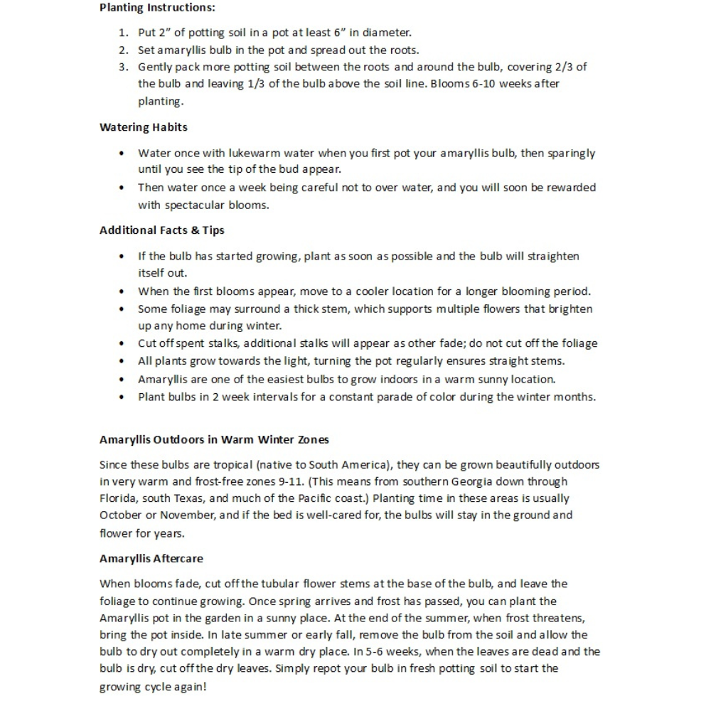 Giant Amaryllis are easy and thrilling to grow indoors, and a great gift for a child or the home bound person. Unlike many other amaryllis bulbs on the market, our large hybrid bulbs will produce two 18-24" stems, each bearing 4 or 5 huge, long lasting flowers that are over 8 inches in diameter.