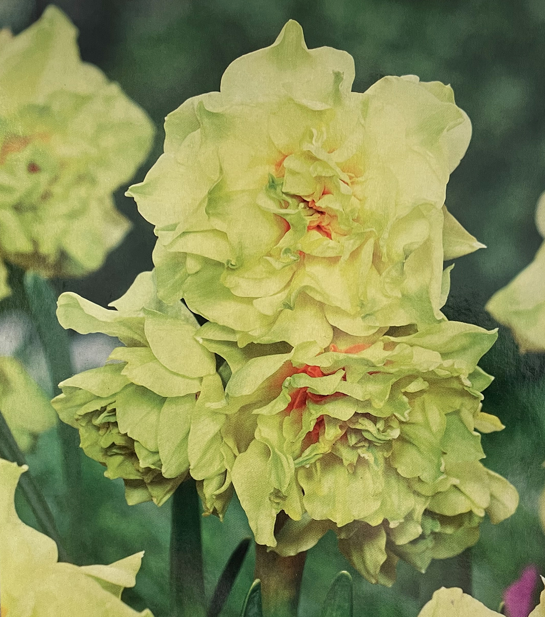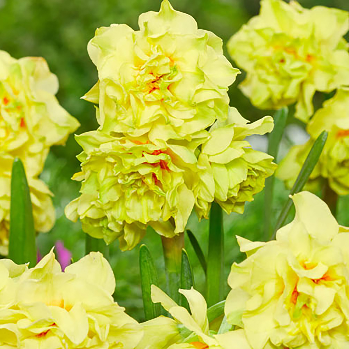 Double narcissi have extra petals. The petals or the trumpet can be doubled and at times both are. Fragrant and floriferous, these selections may need some protection from the wind. Consider planting them under deciduous trees that will not leaf out until after they have bloomed. Daffodil Plant Care: In fall, plant bulbs in deep, fertile, well-drained soil in full sun to light shade. Plant 6" apart and 6" deep in groups of 5,7,9 or more. Water during their growth period. After flowers bloom, let the foliage die back naturally.