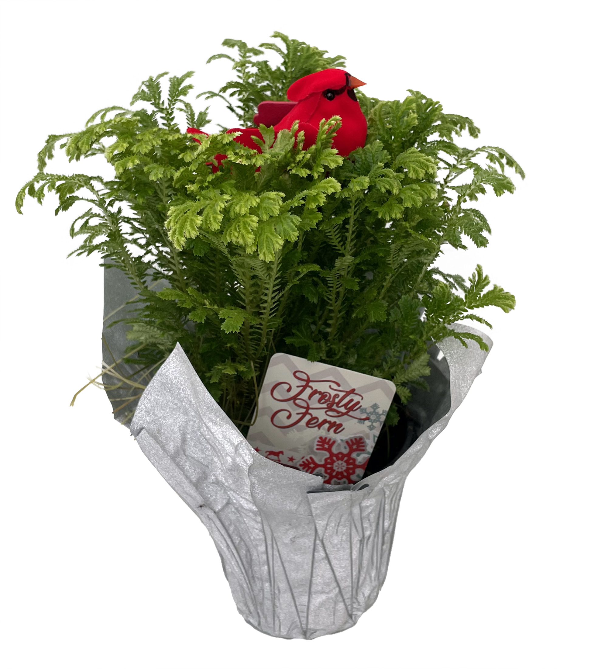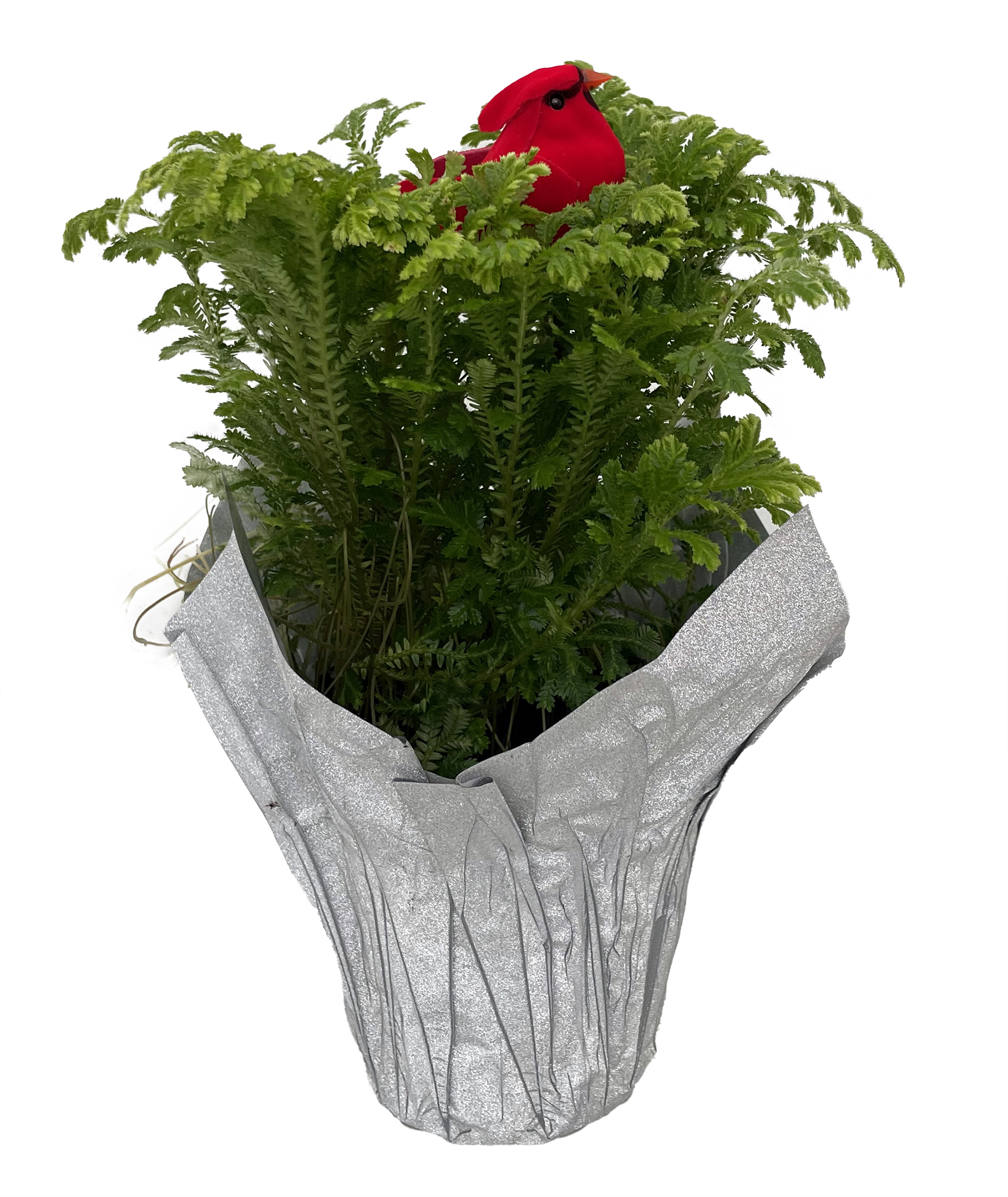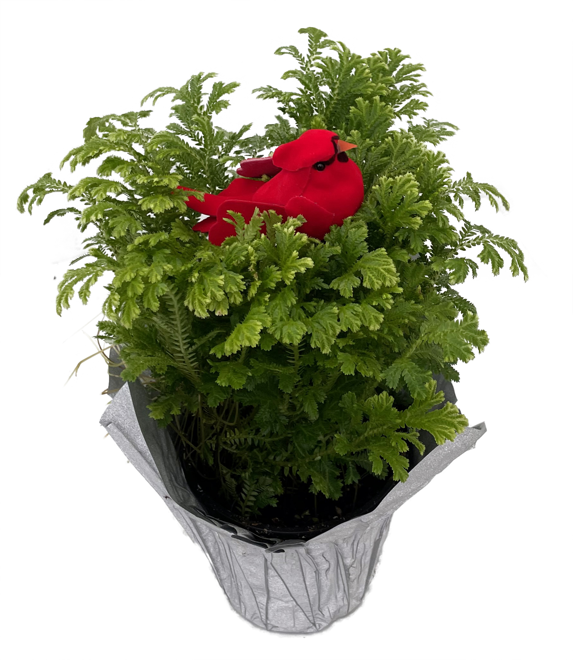 Festive Frosty Fern with Cardinal Pick and Decorative Pot Cover - Selaginella - 4" Pot