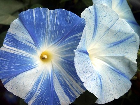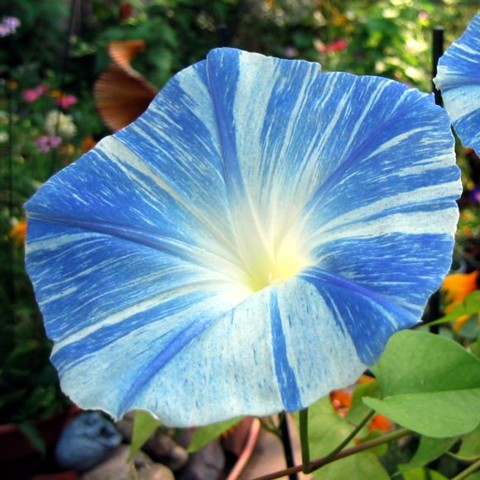 Flying Saucer Morning Glory: Spectacular blue striped flowers make Flying Saucers Morning Glory one of our most popular climbing vines. The vine loves to 'show off' on a trellis, fence, or arbor. This morning glory is a close relative of 'Heavenly Blue.' Proper name: Ipomoea purpurea 'Tricolor.' Fresh, untreated seed!