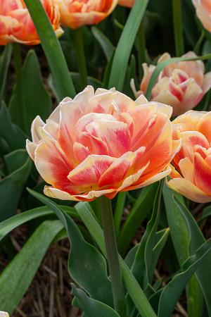 Tulipa 'Foxy Foxtrot' is a captivating Double Early Tulip that transforms as it blooms, creating a dynamic spring display. Initially opening in vibrant citrus-yellow, these peony-like flowers gradually evolve into a mesmerizing blend of apricot, honey-gold, and salmon-rose tones with delicate white highlights. Their sturdy stems and remarkable color-changing ability make them a standout choice for professional landscapers and garden retailers.