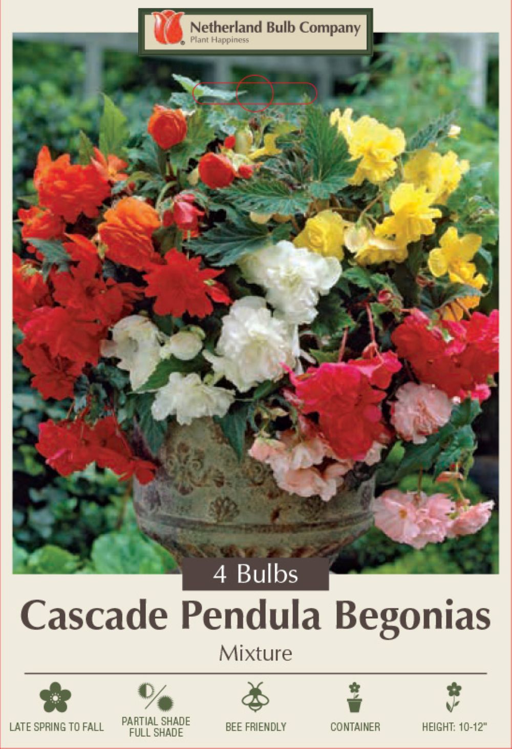 This wonderful fragrant Begonia has double cascading flowers that come in many different shades of pink, apricot, yellow, white, red and orange. The green foliage is distinctively marked with bronze. This Begonia will brighten any container or shade garden. World-famous Belgium bulbs, the finest imported strain of Begonias now available to the American market. Fully double in bright, non-fading colors. They provide long-lasting vibrant color and beauty. Plant in partial shade. They are easy to grow if they get plenty of water and protection from wind and direct sunlight. Adds floral beauty to porch, patio or window box.