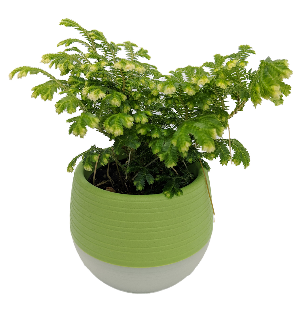The Frosty Fern Club Moss is properly classified as a Lycopod, a descendent of spore-producing plants that date back unchanged into the Permian (320 million years ago) age. Tree-like relatives of this plant group produced the greaat coal forests of the Carboniferous. Other common names for the Frosty Fern Club Moss include; Arborvitae Fern, and Spike Moss. Excellent house plant, terrarium plant or fairy garden plant. Keep evenly moist, not wet or dry. Provide bright, indirect light. Trim as needed.