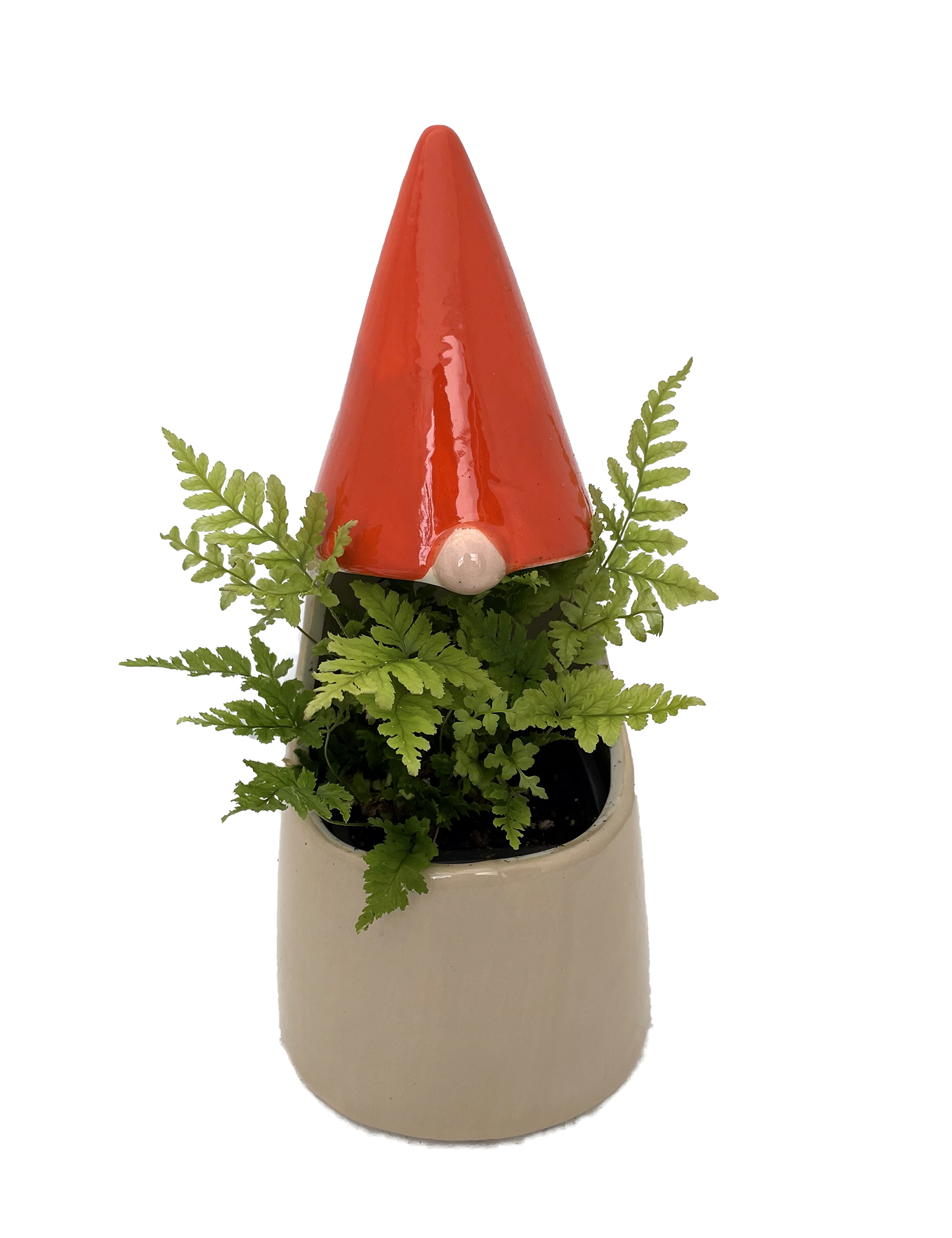 Add some funk to your home or garden! Ceramic Gnome planter with live trailing houseplant, variety of plant will vary. Easy to grow. Prefers bright, indirect light. Keep the soil evenly moist, not too wet or dry. 9" height x 3.5" base diameter, no drainage hole.
