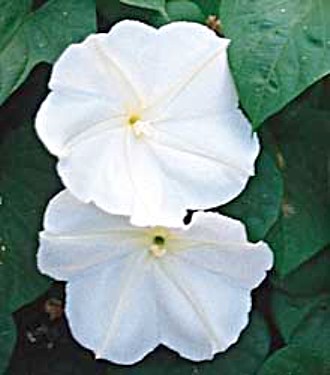 The moonflower is a vigorous twining vine that is very fast growing in really hot weather. It is a tender tropical perennial but is now seeing popular use as an annual vine in colder areas. This close relative of the morning glory has similar heart shaped leaves that are a rich green and 4-8 (10-20 cm) inches long. They provide a beautiful backdrop for the spectacular moonflowers. This vine also known as the evening glory as its buds open in late afternoon and last only until morning's light transforms them into a limp shriveled mass.