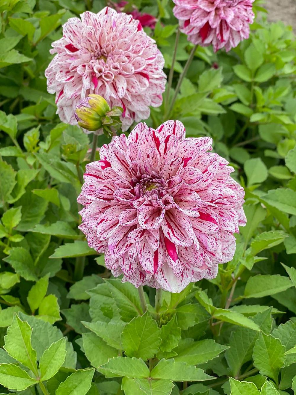 Light pink double flowers have petals with random rose-red slashes and freckles