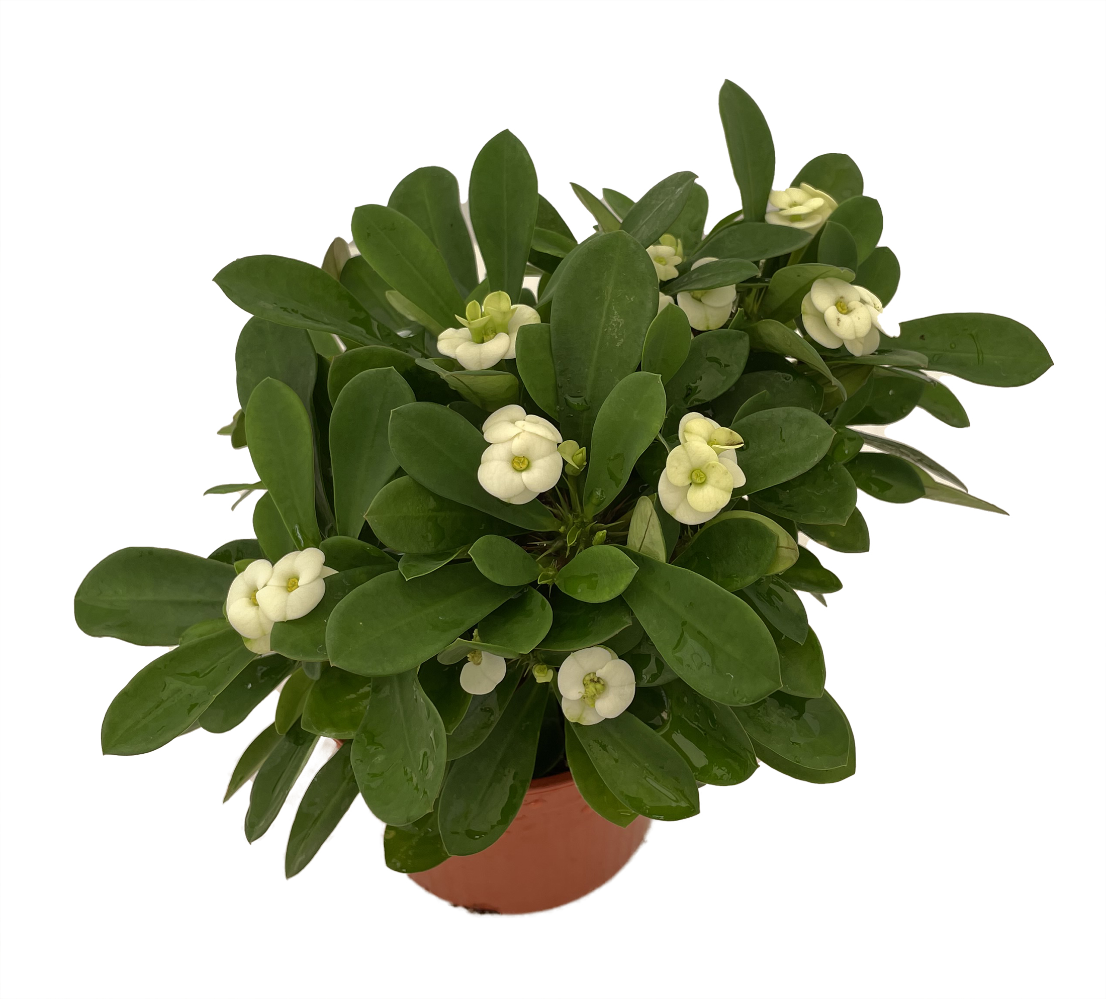 Besides the religious significance of the Crown of Thorns, the plant also has a famous meaning of good luck engrained deeply in many beliefs. Therefore, those who grow the plant should always be blessed with lots of good luck. Crown of Thorns is a plant growing best in a sunny location. During periods of active growth, water when the soil surface becomes dry but when the plant is resting, keep it drier. Ideal temperatures are 62 to 65 degrees at night and 80 to 85 degrees during the day. The plant may be kept cooler during the winter. This is a very easy house plant to grow!Comments: Propagation is by cuttings. Allow the cuttings to dry before placement in the rooting medium. White blooms develop light pink speckles as the plant matures.