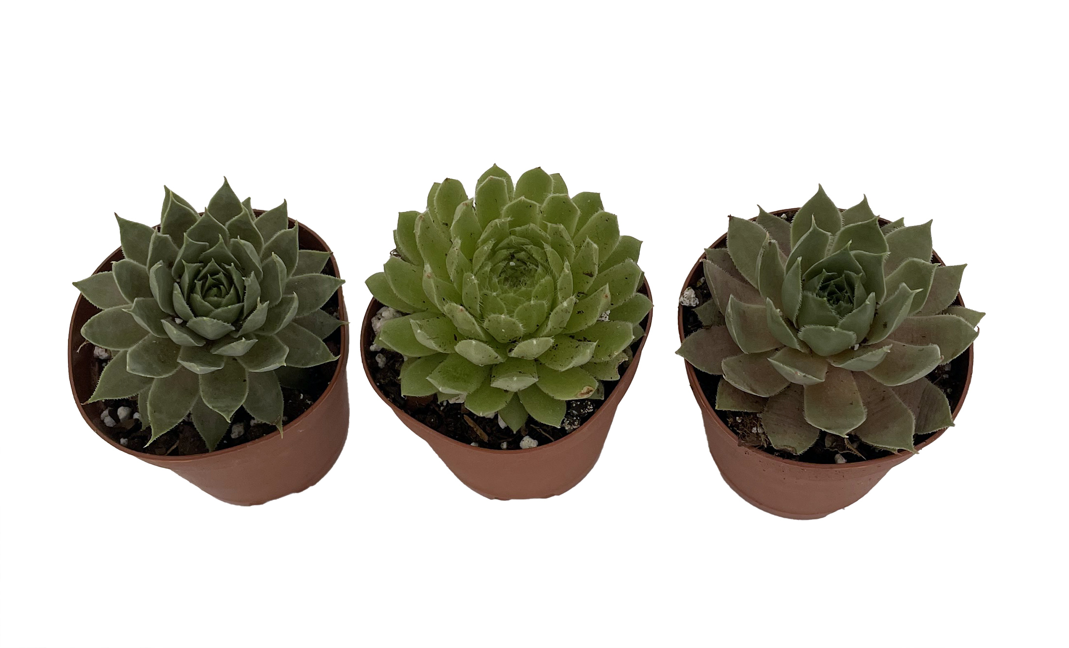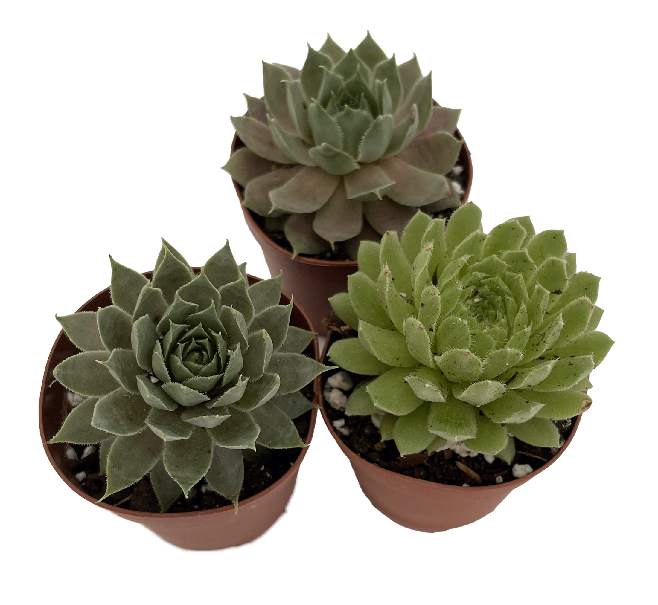 Sempervivum are succulent, rosette forming plants belonging to the Crassulaceae family. They are commonly known as Hens & Chicks, Houseleeks or Hen and Chickens. The main attraction of these plants is their colourful rosettes of leaves. These range from bright yellow, through various shades of green, grey, pink, purple, red, orange and brown, to almost black in some varieties. The leaves may be dull or glossy, or covered with soft down or longer hairs. Small silvery hairs are commonly found along the leaf margins and in many varieties the leaf tips bear a tuft of longer hairs that can form a "cobweb" over the surface of the rosettes. Leaf shape can also vary from short, succulent, almost round leaves to long, tapering, finely pointed ones. The exact variety may vary.