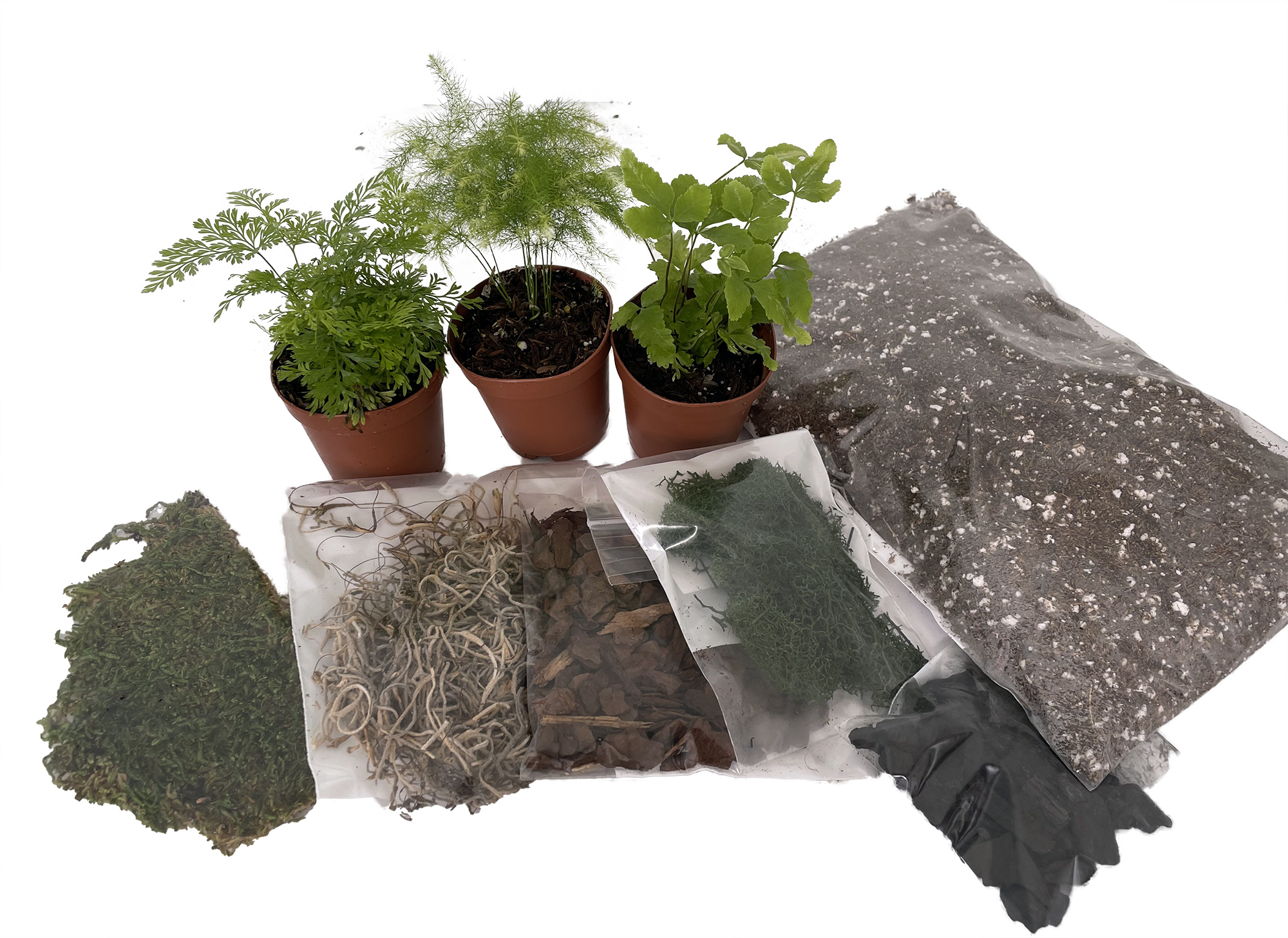 Build your own terrarium! You will receive: Terrarium Kit with Charcoal, Natural Potting Soil, Sheet Moss, Decorative Mulch, Decorative Reindeer Moss and Instructions, 3 Live Mini Ferns and Spanish Moss. Plant selection varies based on the season and selection at the time of order.