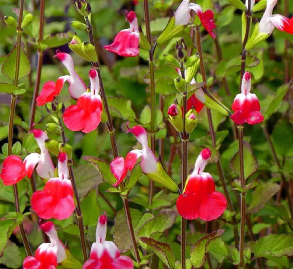 The stunning bi-color flowers of Hot Lips Salvia are surpassed only by the rugged nature of the plant itself. Growing to 2 or 3 feet, this salvia makes a good choice for smaller gardens. As you can see by the stem on the right it can be a little hard to describe the flower color. Individual flowers can range from pink to white with a variety of combinations of these colors or single colors appearing throughout the plant. Sometimes we think there are more solid red flowers in the spring and then sometimes it seems like there are more in the summer. As yet, no distinct pattern of when to expect more bi-color flowers than solid flowers has emerged.