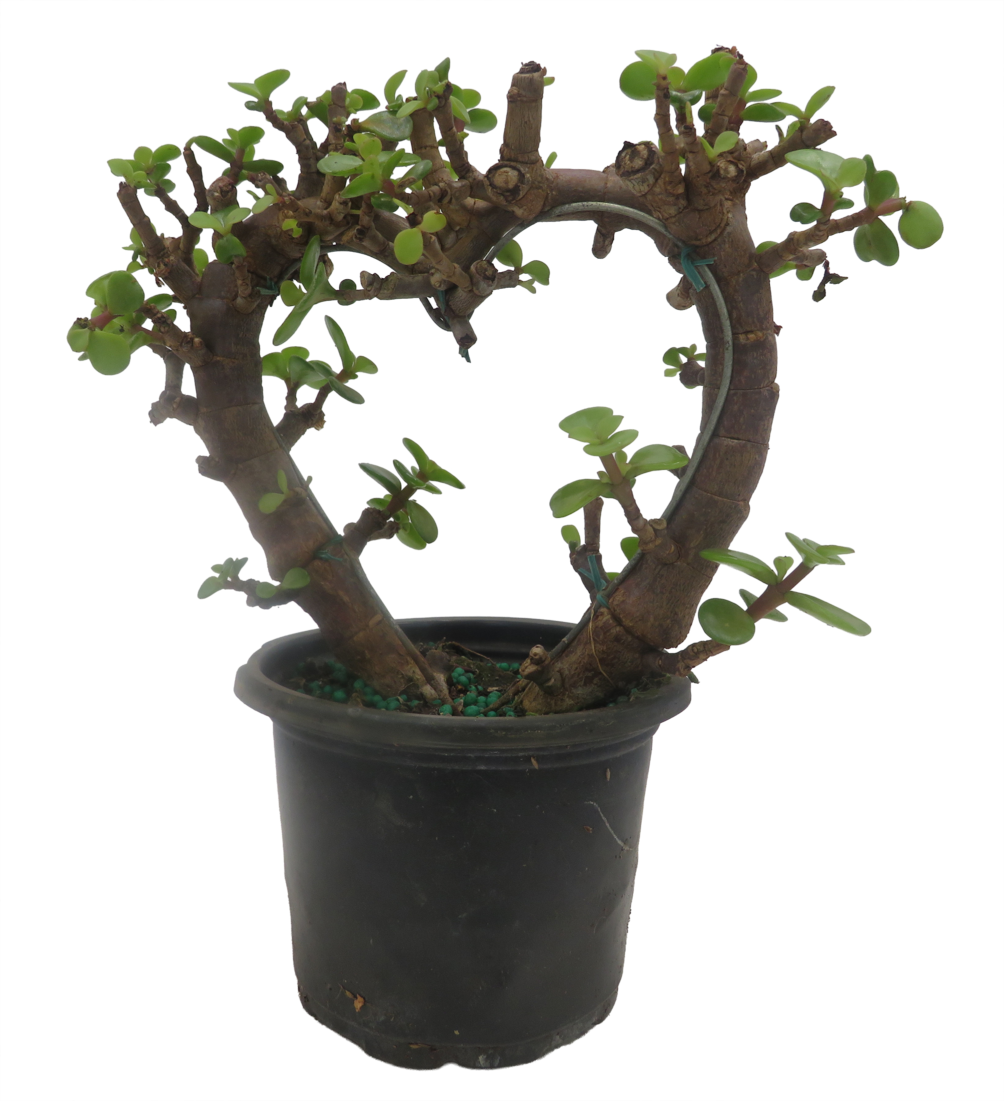 Jades are evergreen plants with thick branches and smooth, rounded, fleshy leaves that grow in opposing pairs along the branches. Leaves are a rich jade green; some varieties may develop a red tinge on the edges of leaves when exposed to high levels of sunlight. New stem growth is the same color and texture as the leaves but becomes brown and woody with age. Under the right conditions, they may produce small white or pink star like flowers in early spring. The jade plant lends itself easily to the bonsai form and is popular as an indoor bonsai.