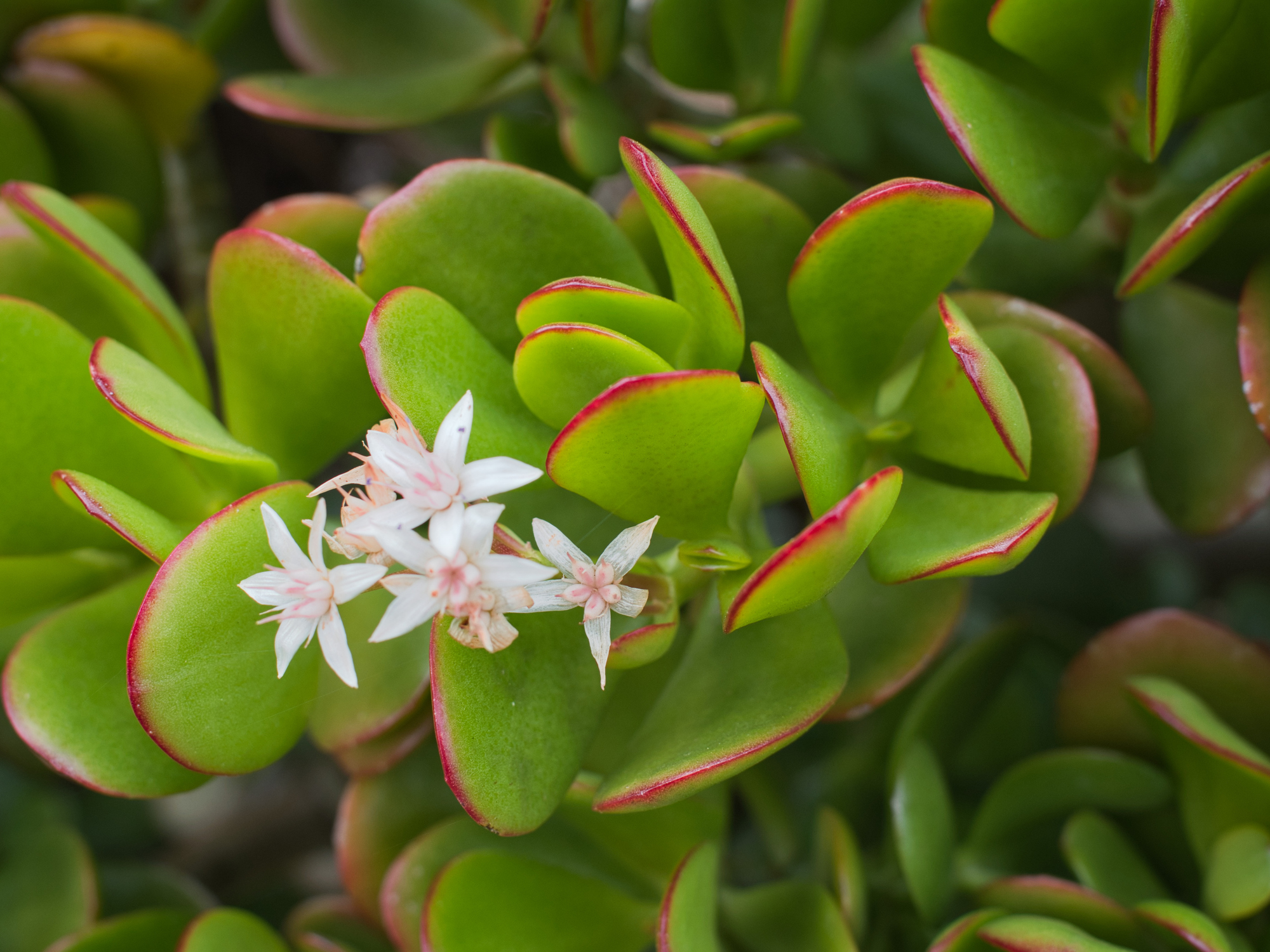 Jades are evergreen plants with thick branches and smooth, rounded, fleshy leaves that grow in opposing pairs along the branches. Leaves are a rich jade green; some varieties may develop a red tinge on the edges of leaves when exposed to high levels of sunlight. New stem growth is the same color and texture as the leaves, but becomes brown and woody with age. Under the right conditions, they may produce small white or pink star like flowers in early spring. The jade plant lends itself easily to the bonsai form and is popular as an indoor bonsai.