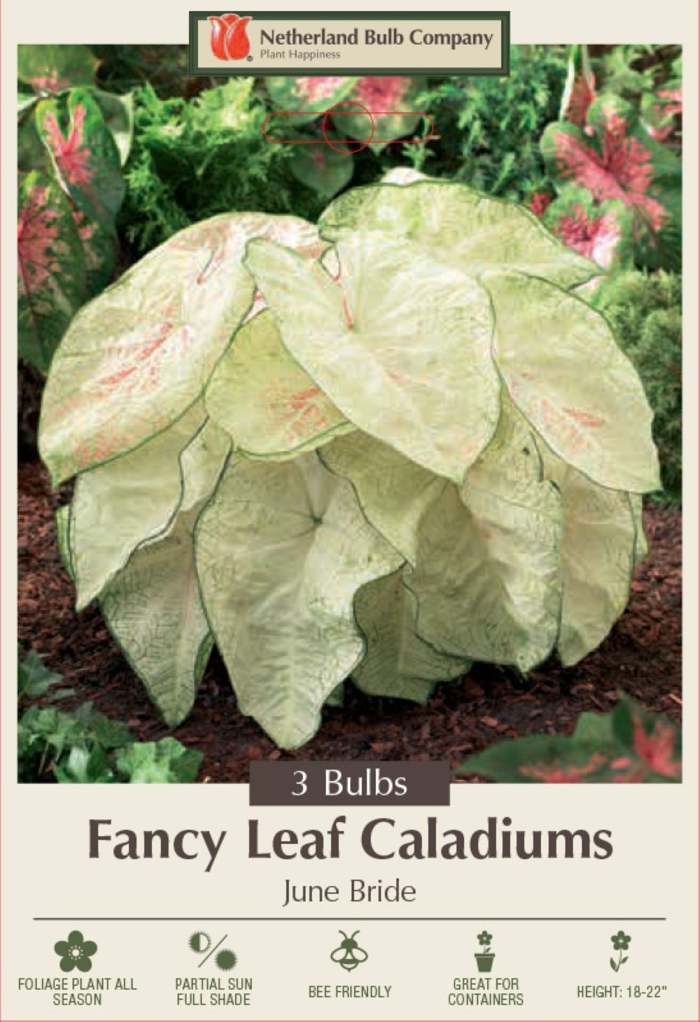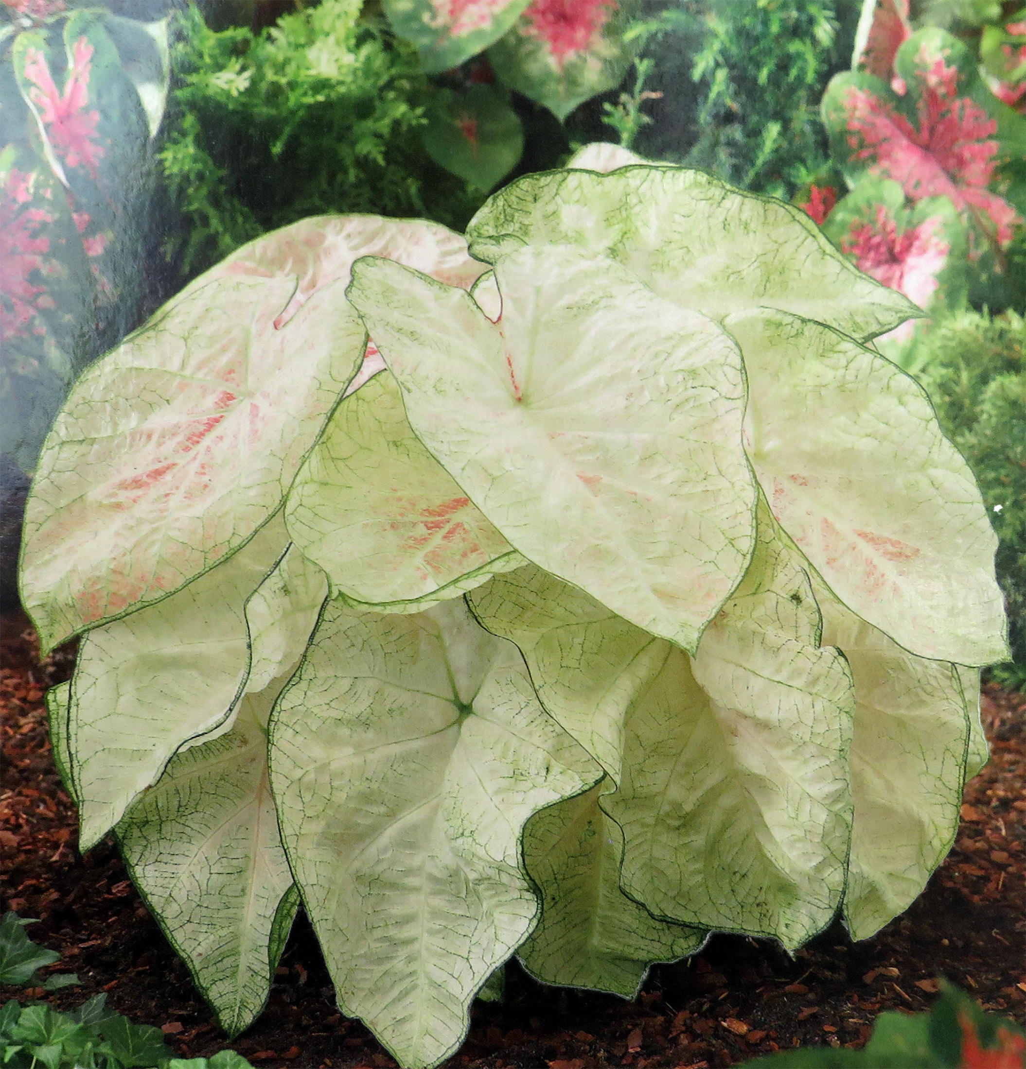 Fancy leafed Caladiums are very showy foliage plants. You'll enjoy these South American beauties with heart shaped, green leaves turning white as they mature with delicate pale green veins. Pot early indoors with a starting temperature of 70 F or more, then plant them, pot and all, outdoors in the shade or semi-shade after spring frosts. Or, plant them in shady window boxes where sun loving annuals won't grow. Water well and spray leaves frequently during hot, dry weather. Excellent for conservatory or warm sun porch during winter.