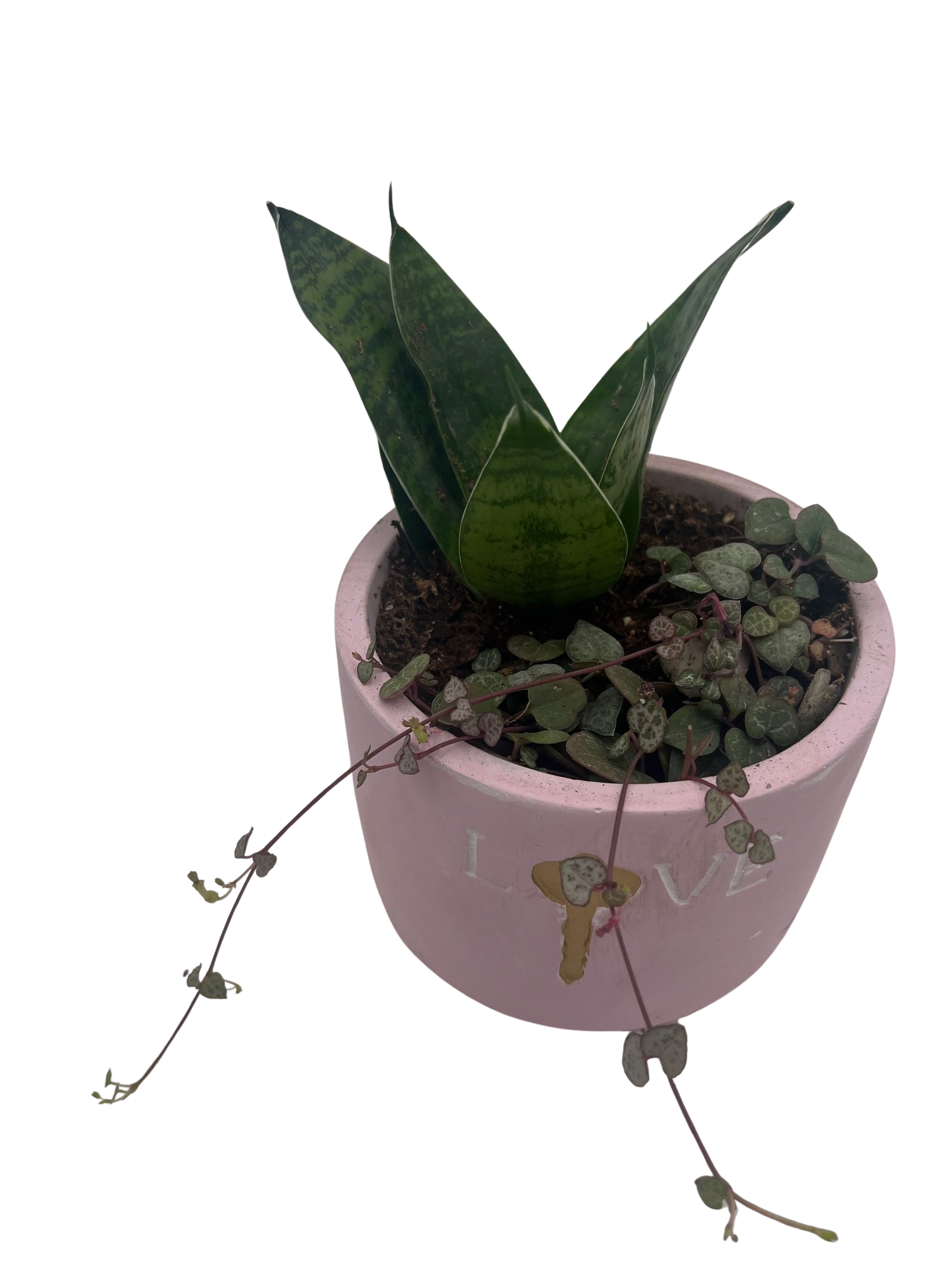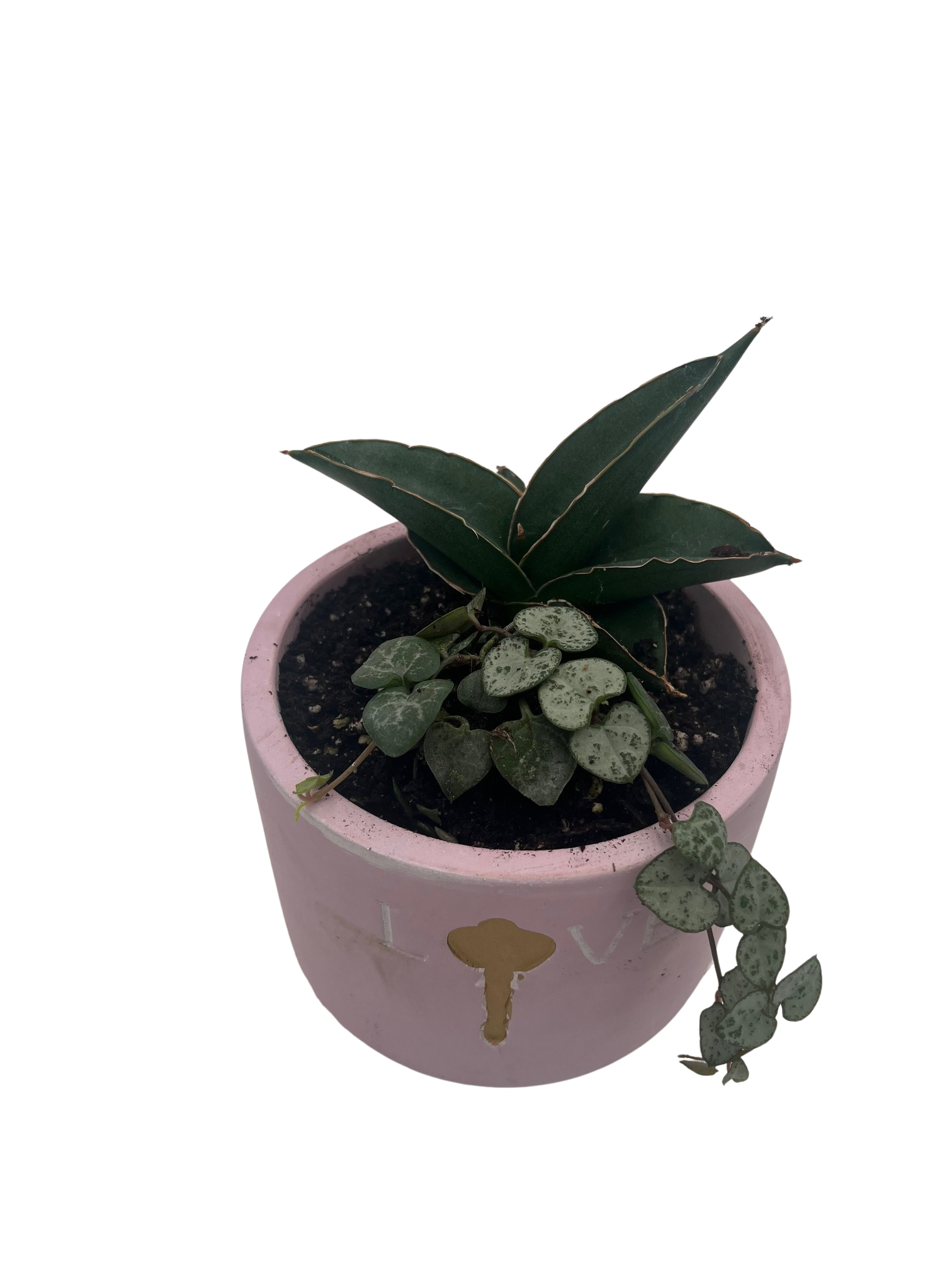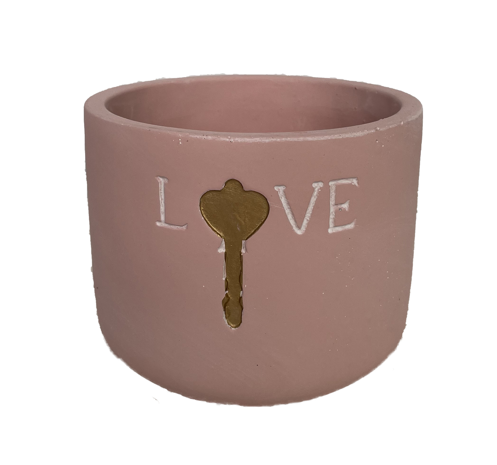 Matte finish soft pink glaze with gold key and LOVE design. No drainage hole. In the planter you will receive a 2" Surprise Snake Plant and 2" String of Hearts. Snake Plant will vary with no customizations.