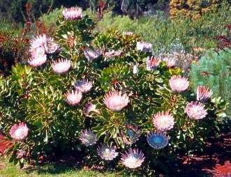 Genus of 115 species. The genus is named after the Greek god Proteus, who was able to change his shape at will, an indication of the diversity and variety to be found in the Protea family. It bears red-pink, open flower heads about 5" across for most of the year, but they are at their showiest in spring. PROTEA cynaroides "King Protea" - Outstanding flowers are up to 12" across with dark pink bracts. Only 5' tall - the leaves are 5" leathery. The largest and most regal protea, the King Protea is the national flower of South Africa. The common names for different proteas promise extravagance, and proteas deliver. Their "flowers" (actually a head or cluster of long, narrow, tubular flowers, often surrounded by colorful petal-like leaves or bracts) come in unbelievable sizes, shapes, textures, and color ranges. These bizarre plants are native to South Africa and Australia. Many people have never seen (or felt) a protea or tried growing one.