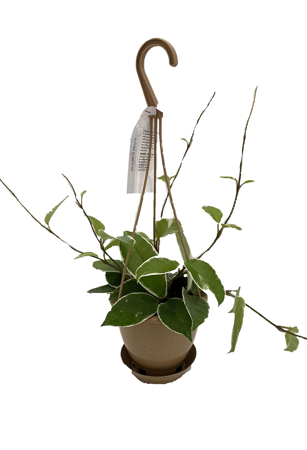 Krimson Queen Wax Plant - Hoya carnosa is one of 100 species of Hoya that are native to Eastern Asia and Australia. The this easy to grow houseplant Hoya carnosa was named for Thomas Hoym, gardener to the Duke of Northumberland at the end of the 18th century. Blooming Time: Summer: Clusters of attractive, star shaped, pink-white blossoms are produced in summer. The delicate flowers appear to be made of porcelain and are truly unique. Culture:Hoya carnosa does best in at least 4 hours of bright indirect or curtain-filtered sunlight. Night temperatures of 60 to 65 degrees and day temperatures of 70 degrees or higher are optimal. Water freely during flowering but allow the soil to become almost dry between waterings when the plants are not rapidly growing. Fertilize every 2 months in spring and summer. Do not remove the leafless spurs or stubs, on which new flowers appear every year. Propagation:Hoya carnosa can be propagated at anytime by air layering or by stem cuttings. A portion of the stem including one or more pairs of leaves will quickly produce roots in water or damp sand. The plant you will receive is growing in a 4.5" Hanging Basket, similar to the one pictured.