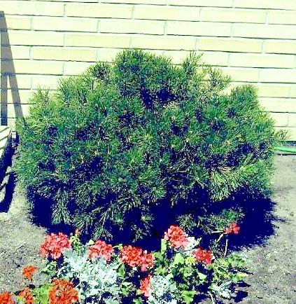 Pinus mugo mughus. Compact, shrubby pine with 2-3" needles; pruning increases compactness. Less susceptible to winter damage than other evergreens. Very easy to grow. Makes an excellent bonsai specimem.