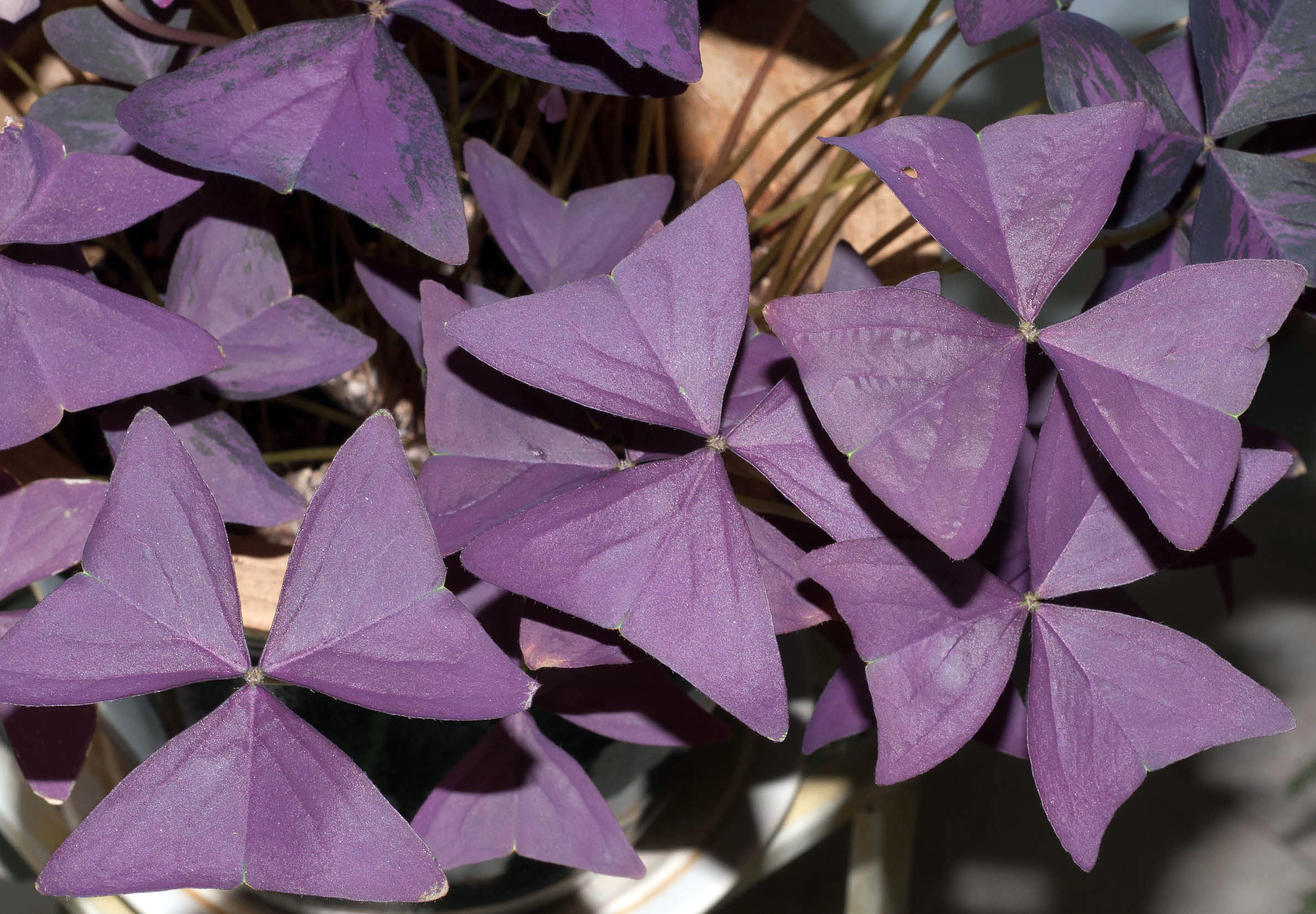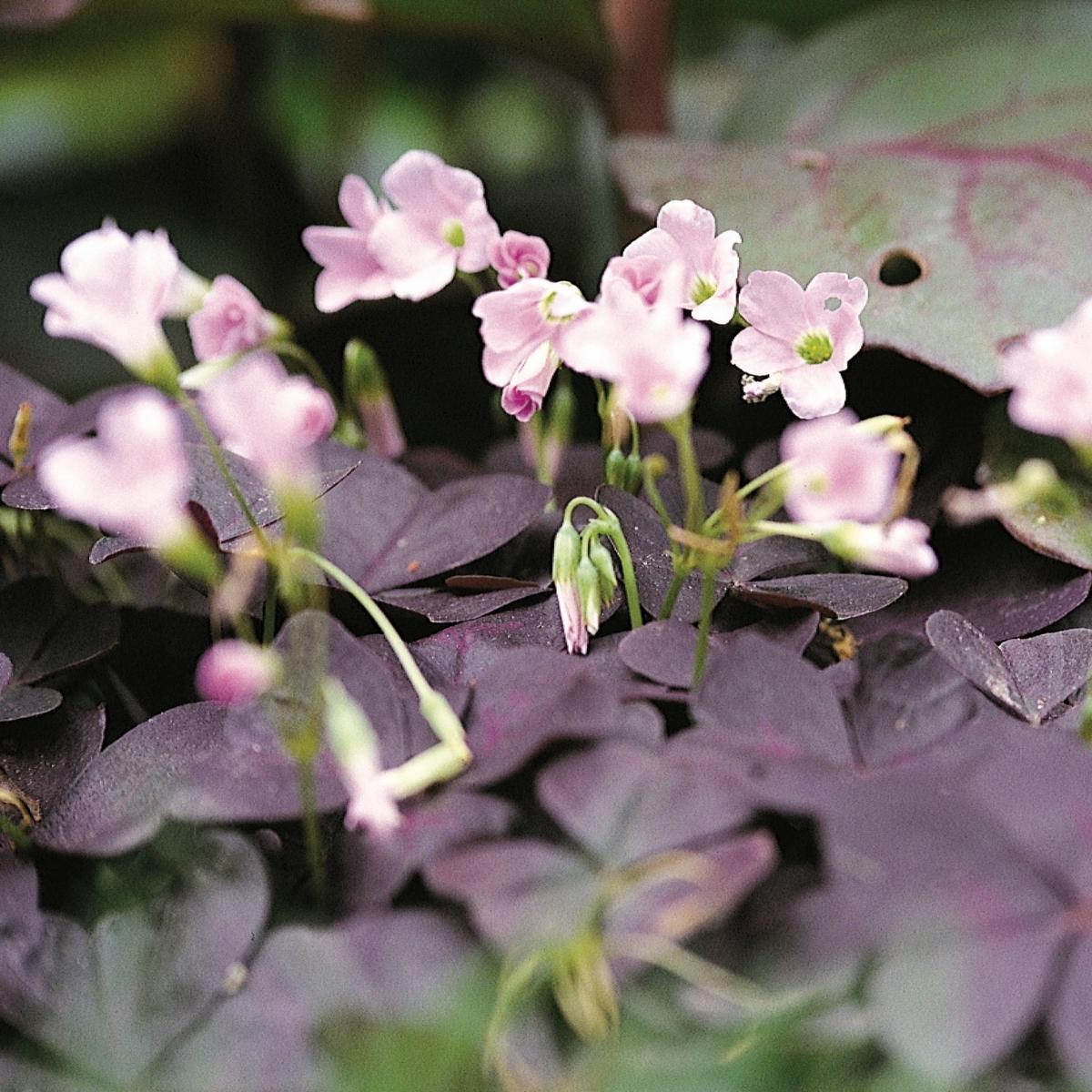 This species is drought resistant, easy to cultivate and recommended for a low maintenance garden. Delicate light pink blooms rise above deep purple shamrock shaped foliage. An edible wild plant that has been consumed by humans around the world for millennia. In Dr. James Duke's Handbook of Edible Weeds, he notes that the Kiowa Indian tribe chewed wood sorrel to alleviate thirst on long trips, that the Potawatomi Indians cooked it with sugar to make a dessert, the Algonquin Indians considered it an aphrodisiac. The leaves contain oxalic acid (whose name references the genus), giving the leaves and flowers a sour taste which can make them refreshing to chew. Indoors this plant is very easy to grow. Provide morning sun or very bright, indirect light and keep evenly moist, not wet or dry. Prune as needed.