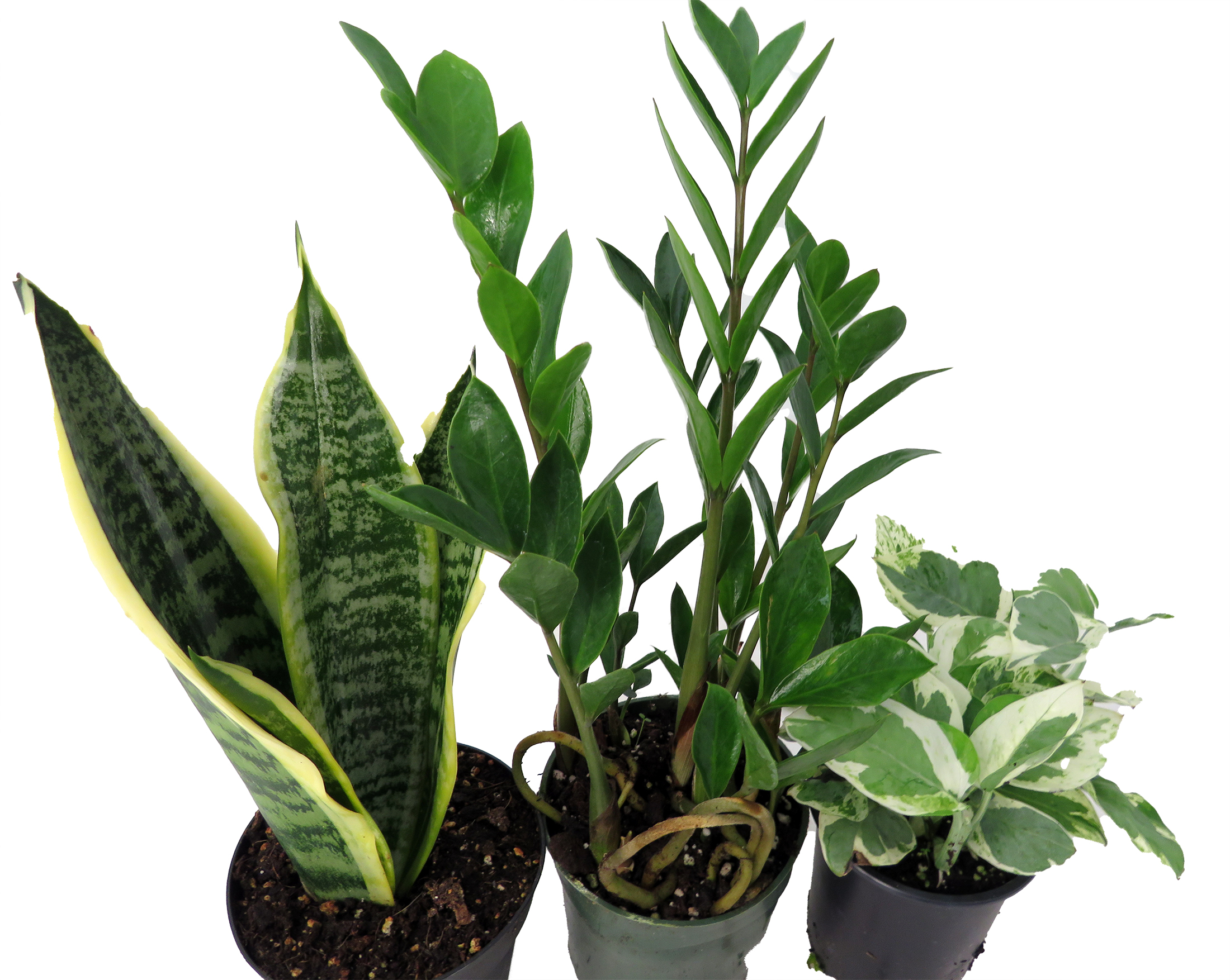 You will receive 3 plants each growing in a 4" pot. Snake Plant, Zamioculcas (ZZ) Plant, Pothos aka Devil's Ivy (variety sent may vary).
