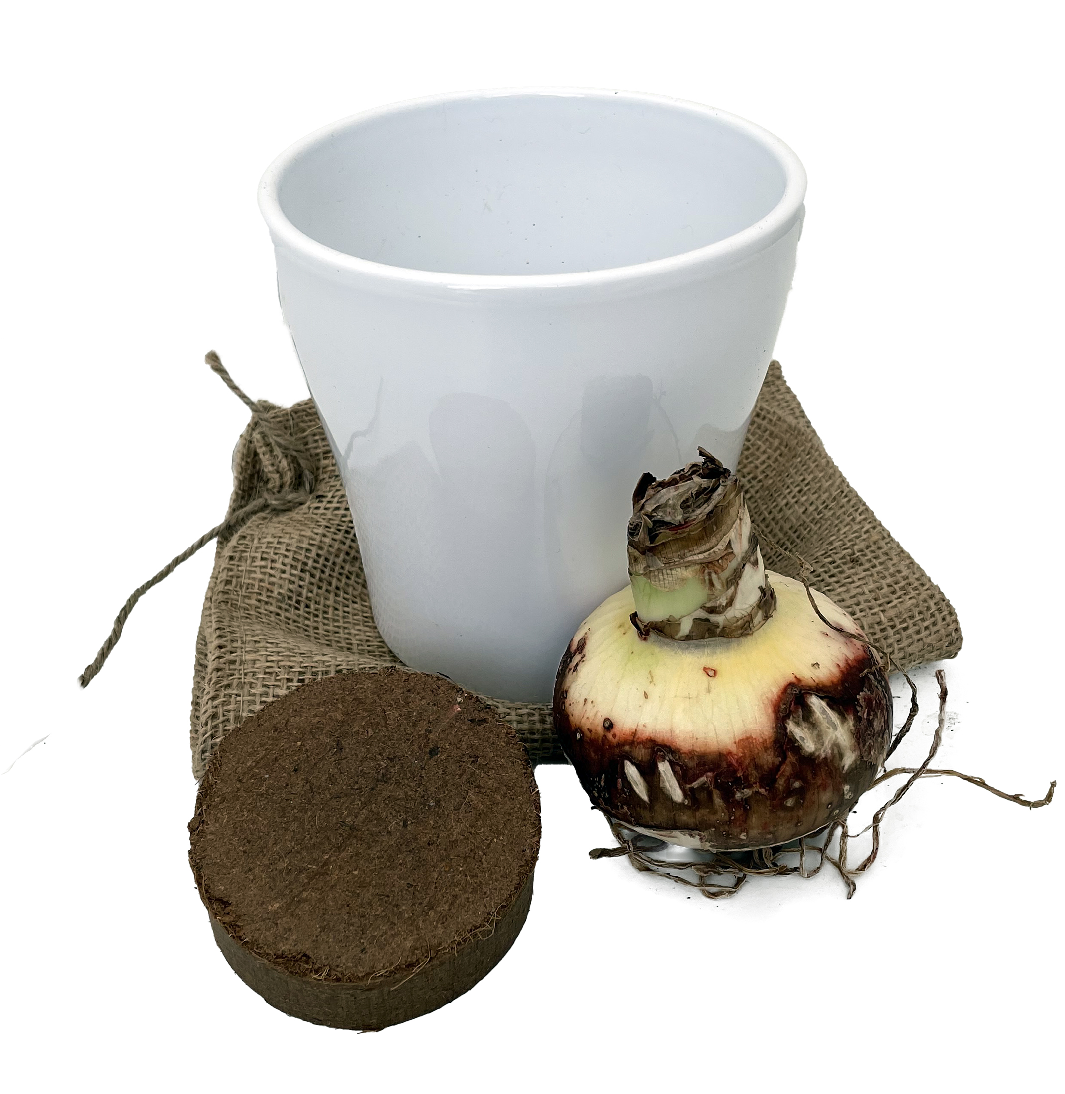 Kit inludes: Burlap Bag, Bow & Gift Tag, Growing Medium. Large premium amaryllis bulb (24/26 cm Bulb)