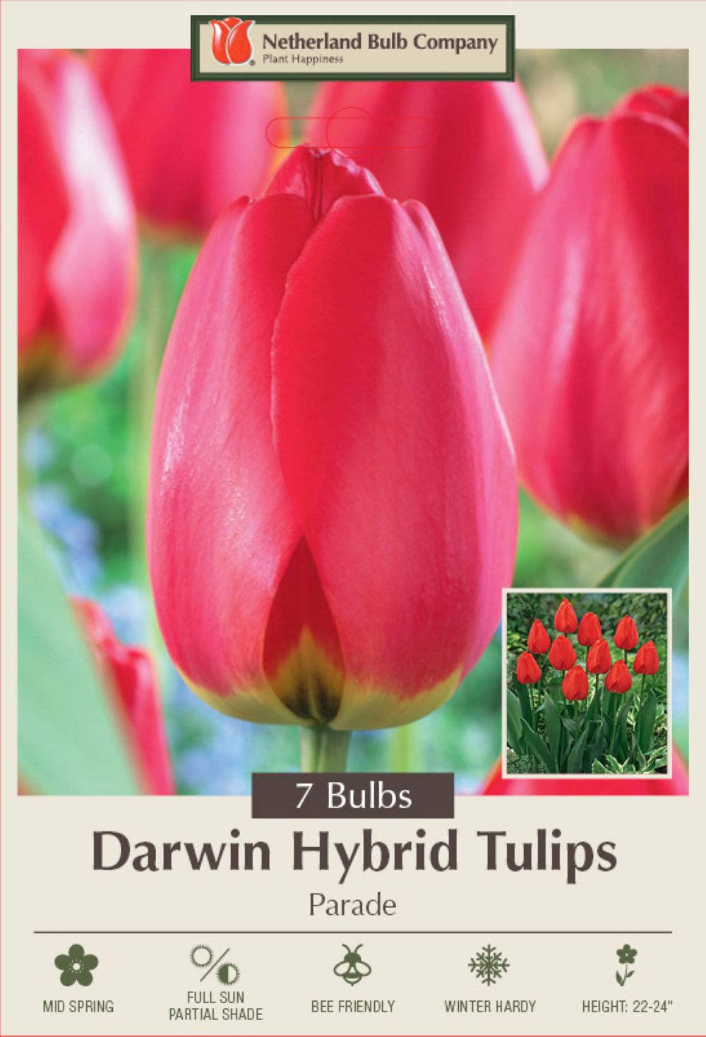 Parade Darwin Hybrid Tulip - Vivid Red-Orange - 12/+ cm Bulbs -7 Bulbs