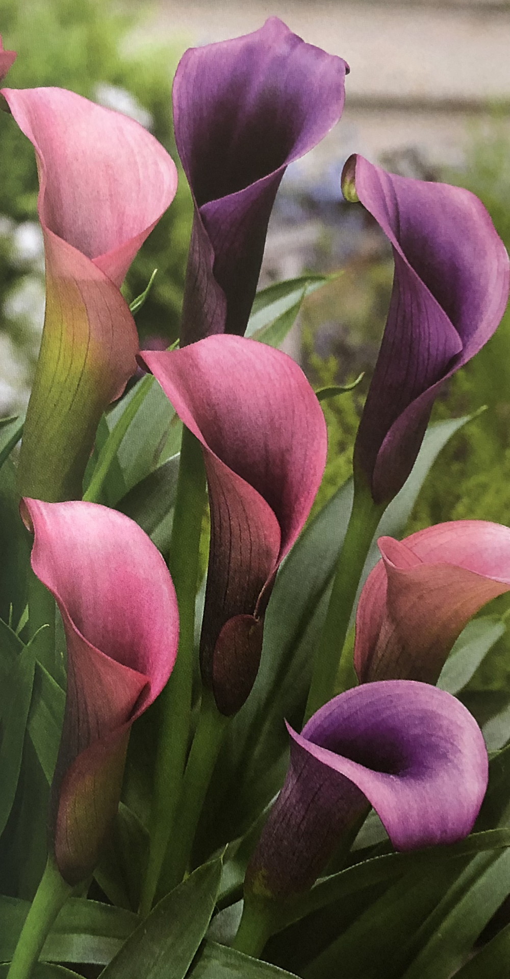 A beautiful multi dimensional calla lily which changes from shades of deep purple to light pink. A delightful calla lily for your cut flower arrangements. This item will Bloom/Grow Early Summer These beautiful cup-shaped, upright trumpets are about 5" tall and 2 - 3 " across. Enjoying full sun to partial shade and growing 8 - 24 " tall, they are the best varieties available anywhere. Calla Lilies are natives of South Africa, now grown in southern California and can be used in beds, borders, patio pots or planters... also indoor house plants. Attractive broad sword-like green foliage.