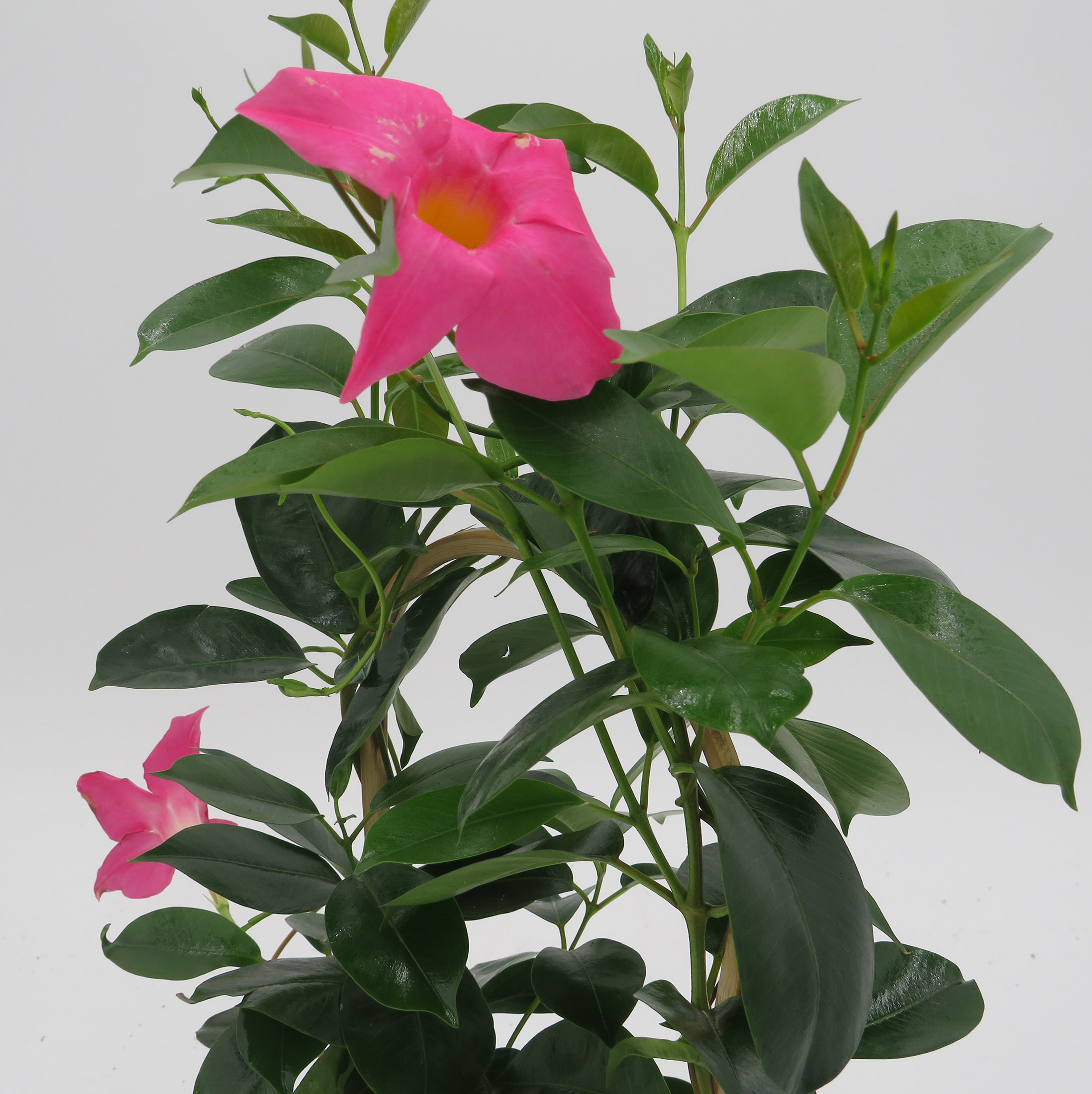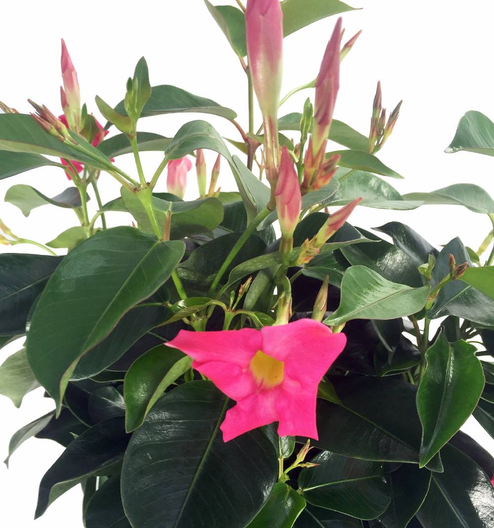 Pink Brazilian Jasmine (Mandevilla) Originally found in the hills above Rio de Janeiro Conditions: Does well in pots and hanging baskets. Requires sunny position, tolerates partial shade. Not frost tolerant. Needs well drained potting mix, with slow release fertilizer application in Spring and late Summer. Keep moist but do not allow to stand in water. Blooms all spring, summer, and fall! Indoors grow in a sunny window. Trim as needed!