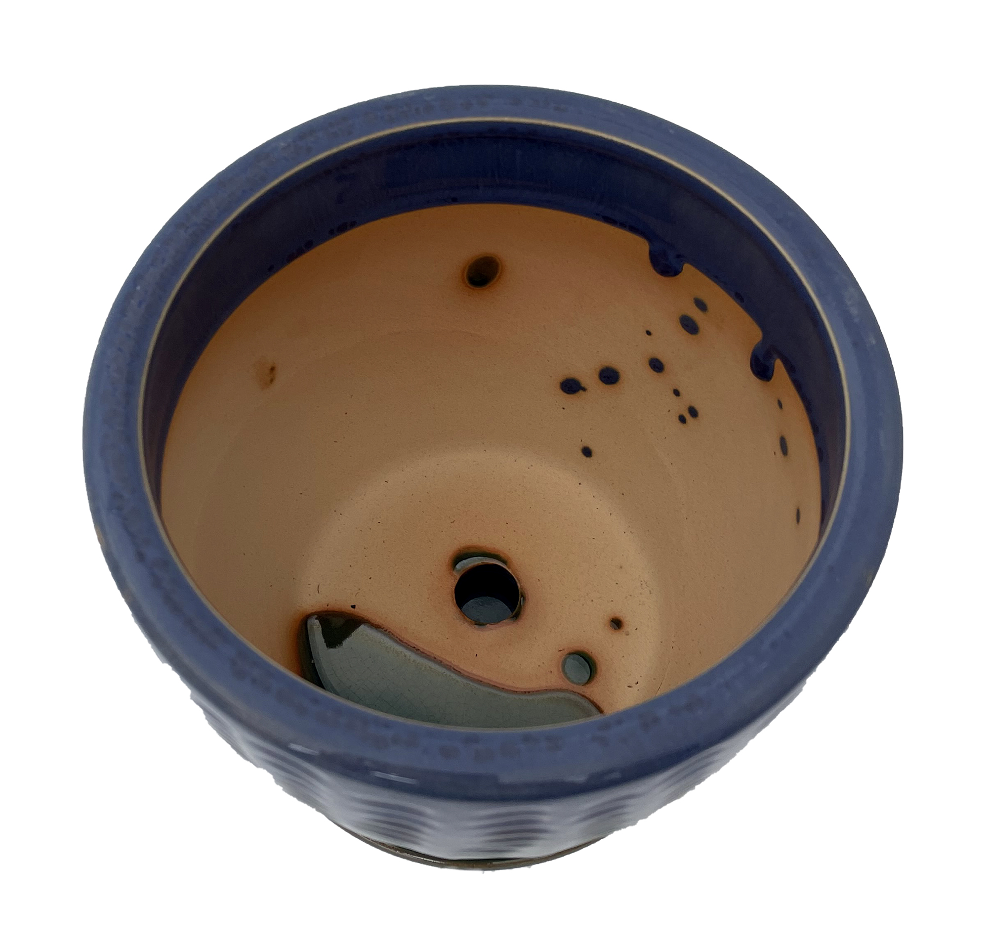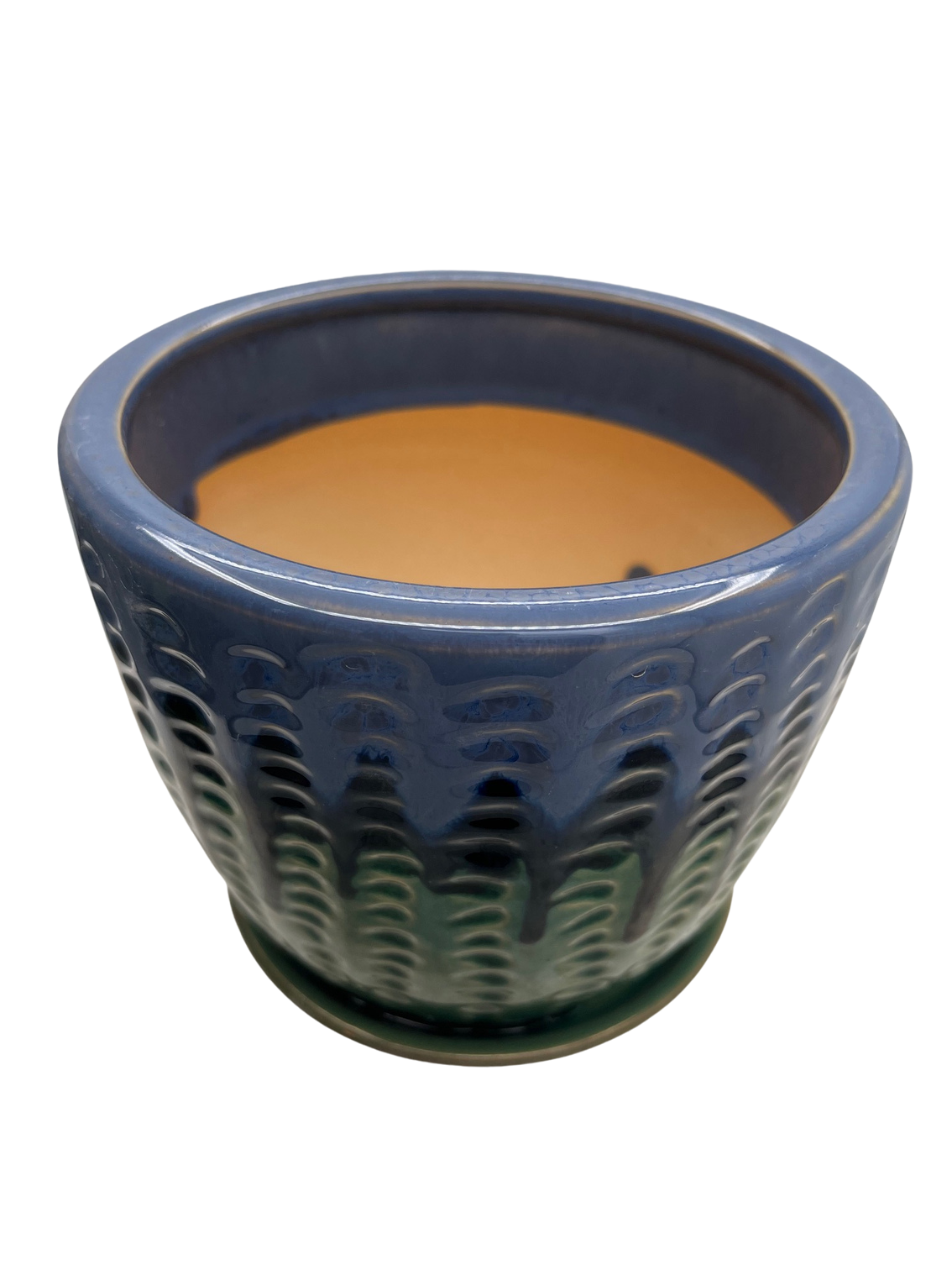 Heavy glazed ceramic pot with attached saucer in blue and green and a glossy dimpled finish. One drainage hole, attached saucer and foam pads on base to prevent scratching.