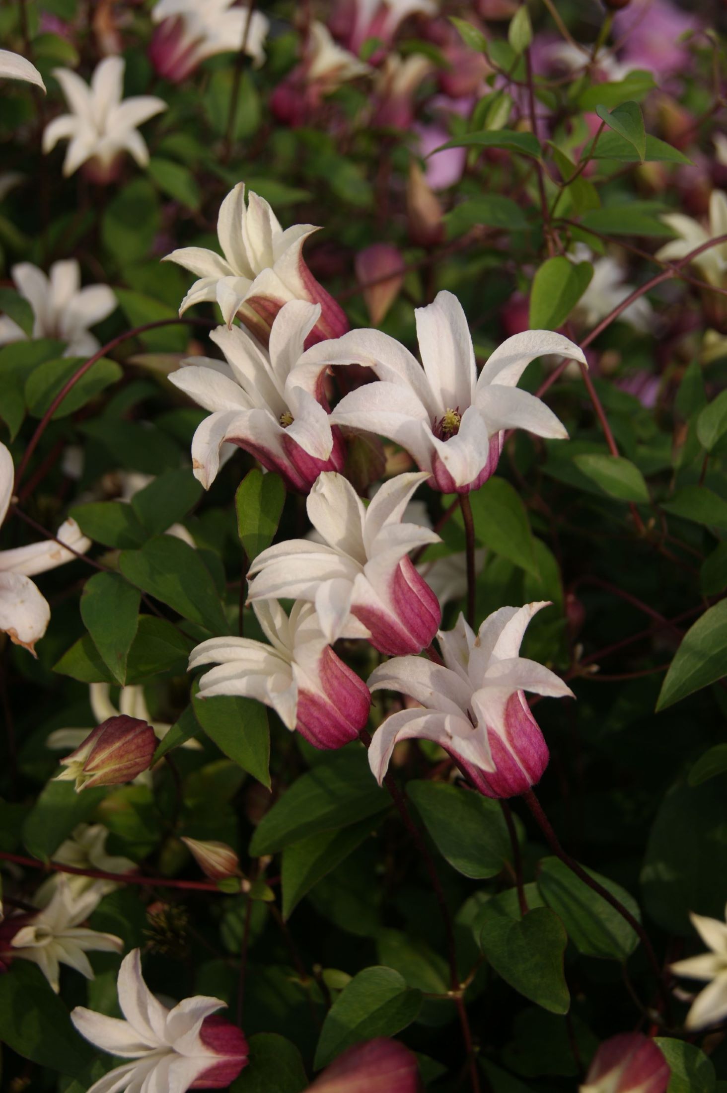 Princess Kate Texensis clematis produces nodding, bell-shaped 2-3” flowers that are white on the inner petals and pink on the outer side of the petals. The flower has dark plum tones anthers that create a nice contrast with the white flower. Blooms summer and into fall, grows to height of 8-13ft.