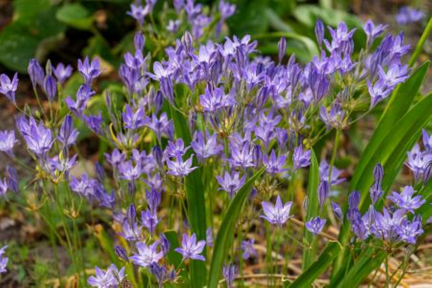 These midsummer-blooming corms are native to west-coast North America. They are adapted to fairly dry meadows and do well in the rock garden. Many species formerly called Brodiaea are now called Triteleia. Bridges late spring into summer. Dainty bloom clusters up to 5" across. Dependable "true blue". Plant thickly for best effect. Terrific in bouquet.