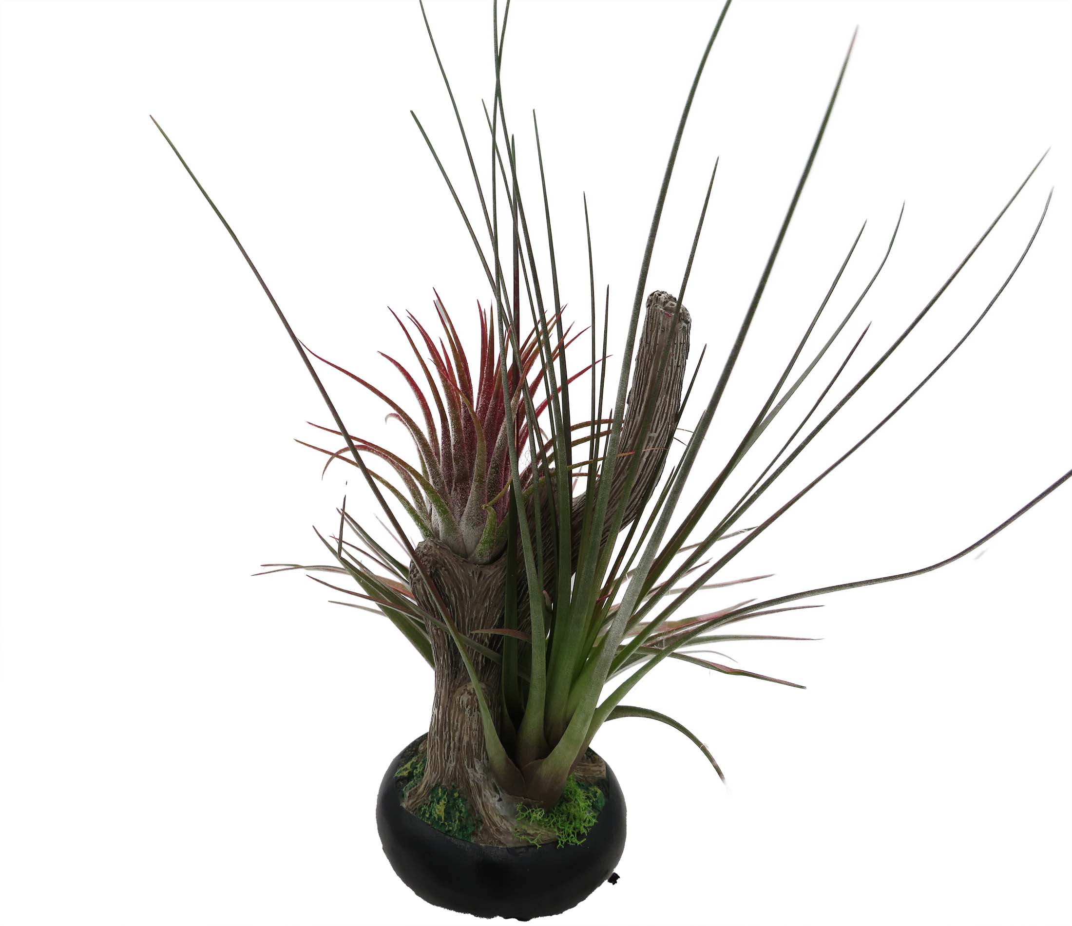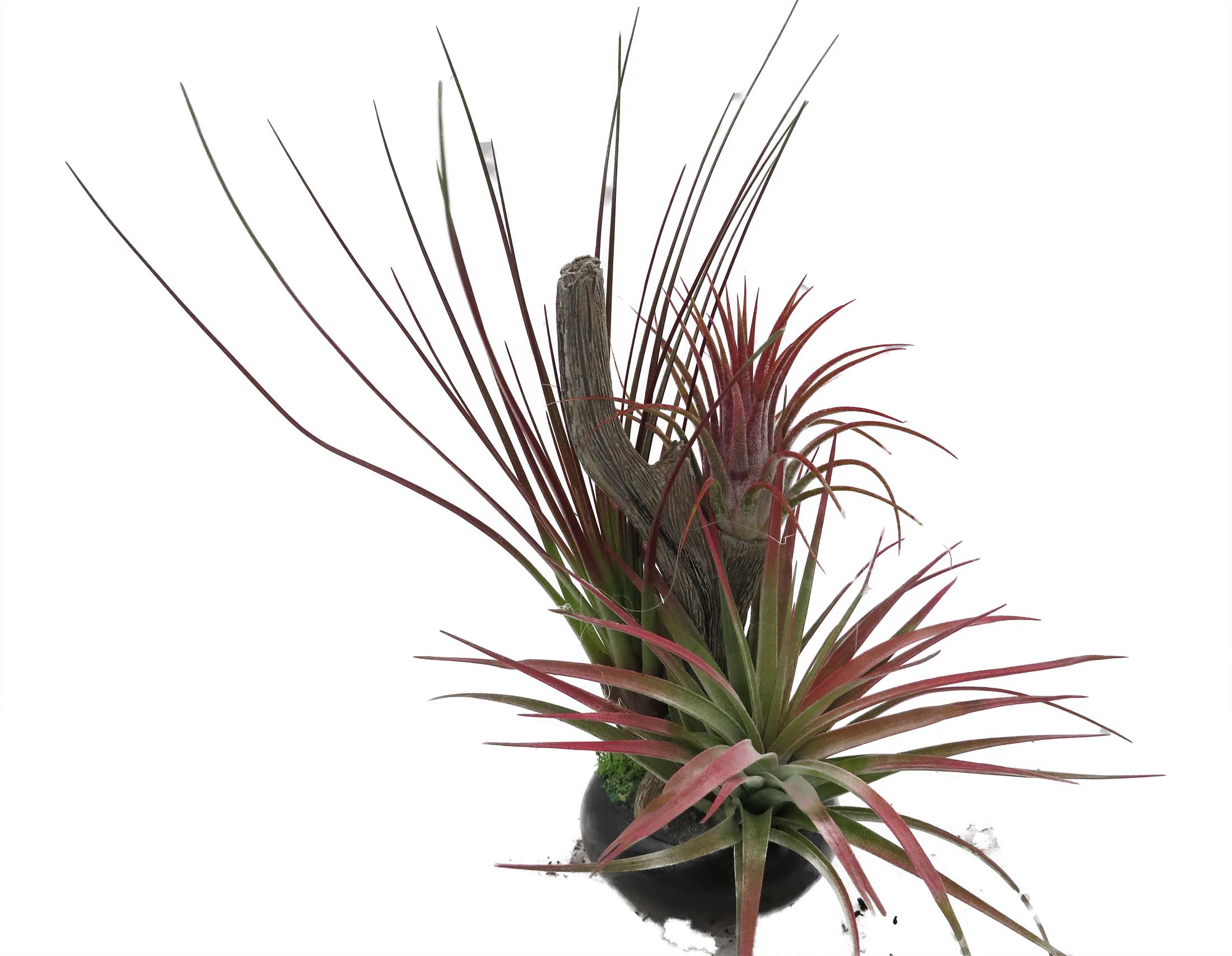 Epiphytic Tillandsia plants are among the most fascinating of all tropicals because they do not require soil to grow. Because there is no soil, watering is, in the main, via humidity. Tillandsias are a group of epiphytic plants that are native to South and Central America. These plants grow without soil in the tops of trees and on rocks in a variety of conditions. These plants absorb their moisture through tiny spongelike tentacles that cover their leaves. Tillandsias enjoy high light and good air circulation. After blooming the plant will put out new offsets (pups) from between the leaves at the base of the plant. Water it 3 times a week by misting, allow plant to dry between watering. It likes bright indirect light or full light.