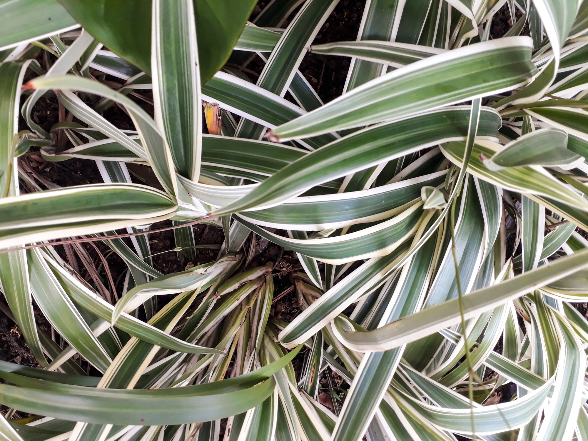 The reverse variegated spider plants have leaves with white outer stripes, and a green stripe between.