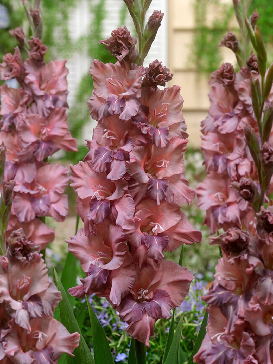 Gladiolus Rusty Chestnut, with its subtle twilight tones is hard to describe but easy to love. Ruffled, milk chocolate buds open to silky, flouncy florets in muted shades of dusky purple with highlights of bronze. Throats flaunt a soft coppery tinge. Flowers of Gladiolus Rusty Chestnut scramble up the stems, opening from the bottom up, above sword-like foliage to provide beautiful vertical accents. Parrot Gladiolus are showstoppers in both the sunny border and your favorite vase.