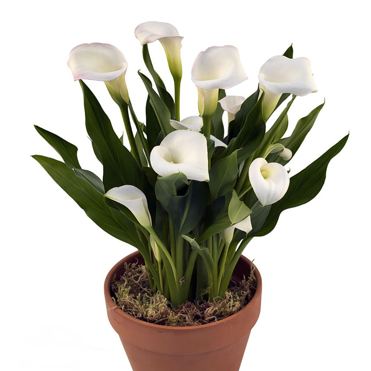 Striking clear white blooms are classically shaped. Calla Lilies are natives of South Africa, now grown in southern California and can be used in beds, borders, patio pots or planters... also indoor house plants. Attractive broad sword-like green foliage.
