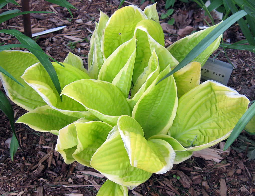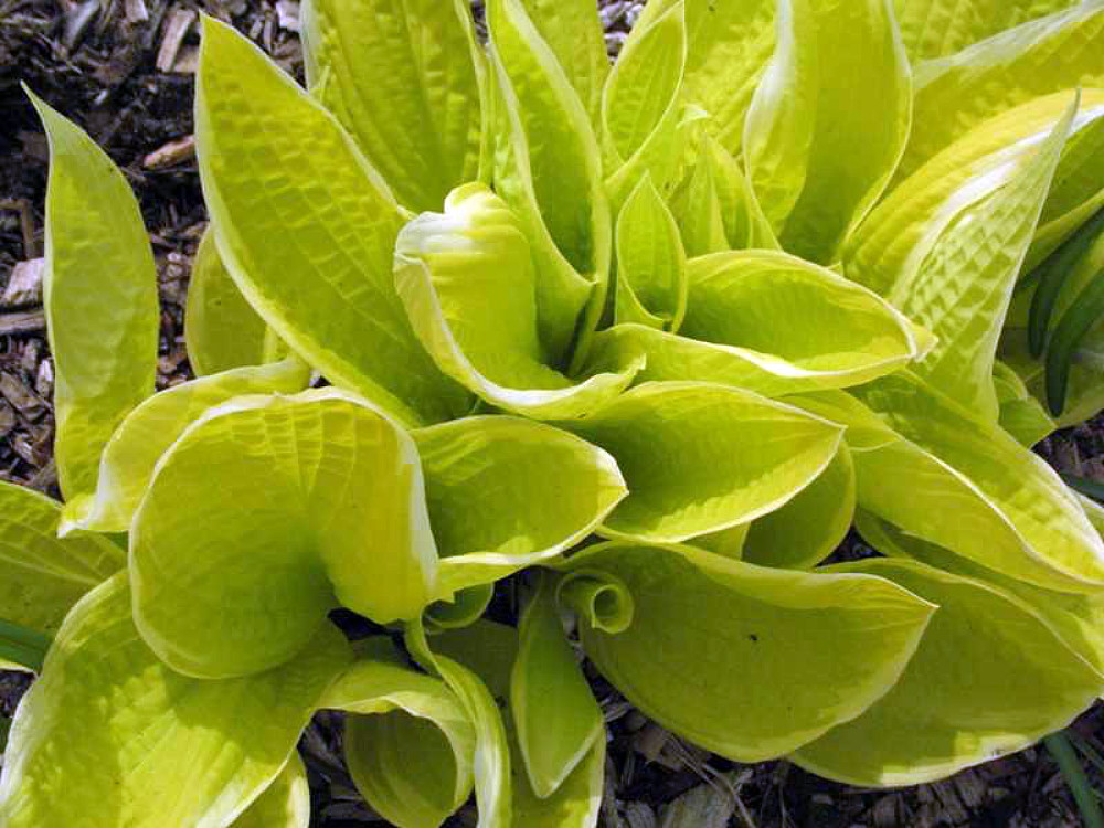 Hosta are among the most popular of perennials for shady areas, with literally hundreds of varieties now readily available. Plants form a sturdy mound of foliage, topped with lily-like blooms. This is a midsized selection with leaves emerging in spring with lovely buttery-yellow centres that soon darken to green with smooth, pure-white margins. In summer, there is a dramatic effect, when on the same plant, there are new yellow leaves as well as the more mature green ones. Pale lavender flowers appear midsummer and may attract hummingbirds. Suitable for planting in mixed containers and tubs. Hosta go completely dormant in the fall, and the dying foliage can be removed any time mid-spring. Easily divided in either spring or fall, but plants may also be left alone for years. A Sport of ‘Sea Fire’.