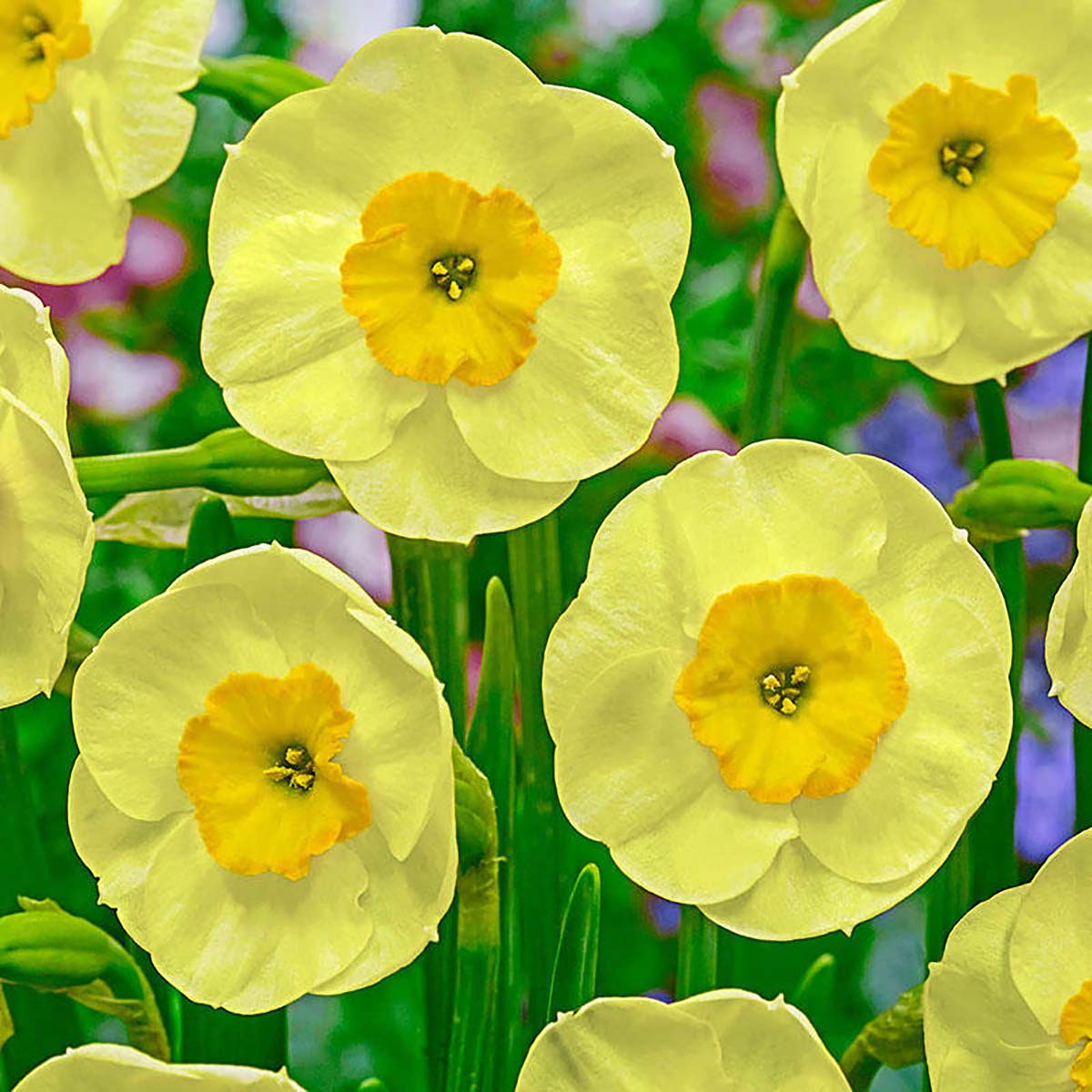 Jonquilla Daffodils like hot, baking summer sun and are well adapted to growing in the Deep South. They also thrive in cooler parts of the country. These Daffodils naturalize well, creating beautiful sweeps of color. Each stem holds several small, fragrant flowers. Narrow, dark green leaves.