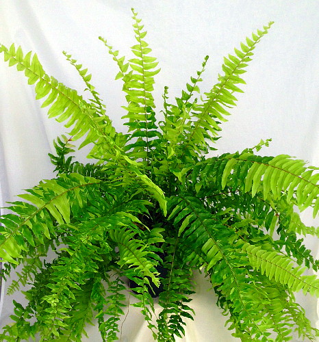 Showing no definitive pattern, each frond exhibits random markings in colors which vary from dark green to lime green to golden yellow. Intermixed between the striped foliage, a few fronds add richness to the plant as luminous blondes. ‘Tiger Fern' is a natural mutation of the Boston fern (N. exaltata ‘Bostoniensis’). It was discovered in Bogor, Indonesia, in the spring of 2000.